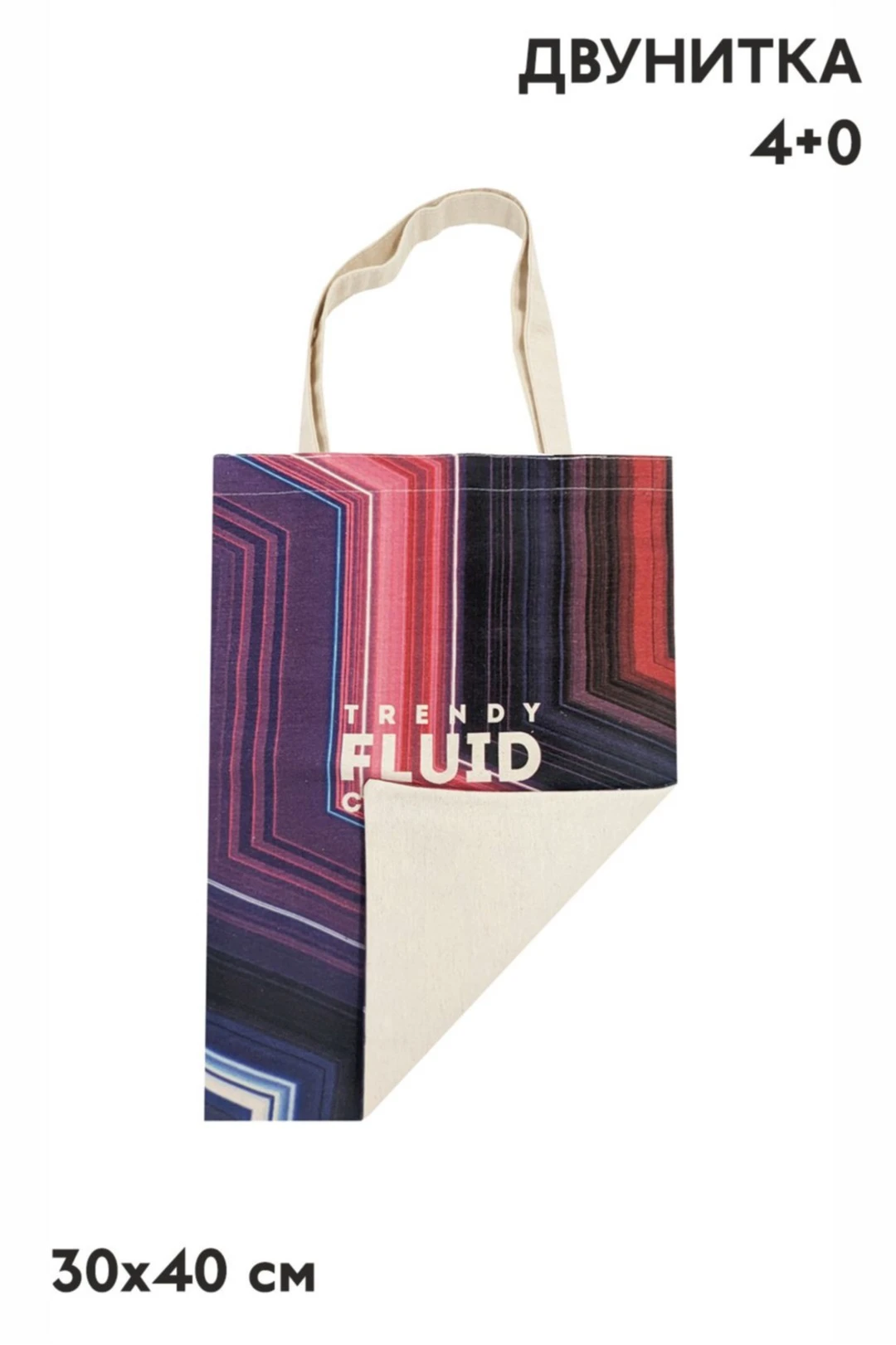 Печать с двух сторон: полноцветная печать осуществляется на хб материале с двух сторон по всей поверхности сумки, ручки сумки запечатываются фоновой заливкой без элементов дизайна.
