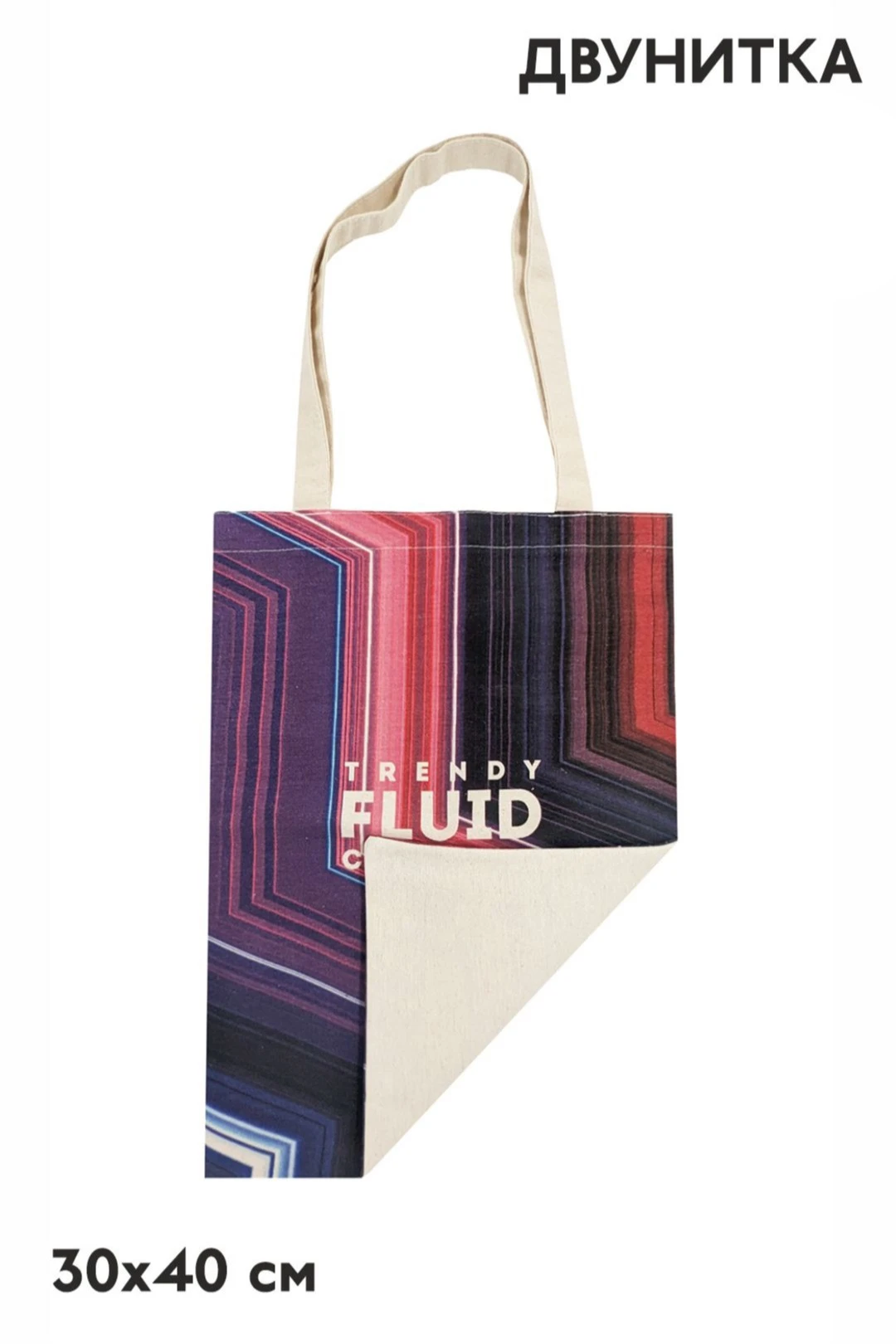 Печать с двух сторон: полноцветная печать осуществляется на хб материале с двух сторон по всей поверхности сумки, ручки сумки запечатываются фоновой заливкой без элементов дизайна.