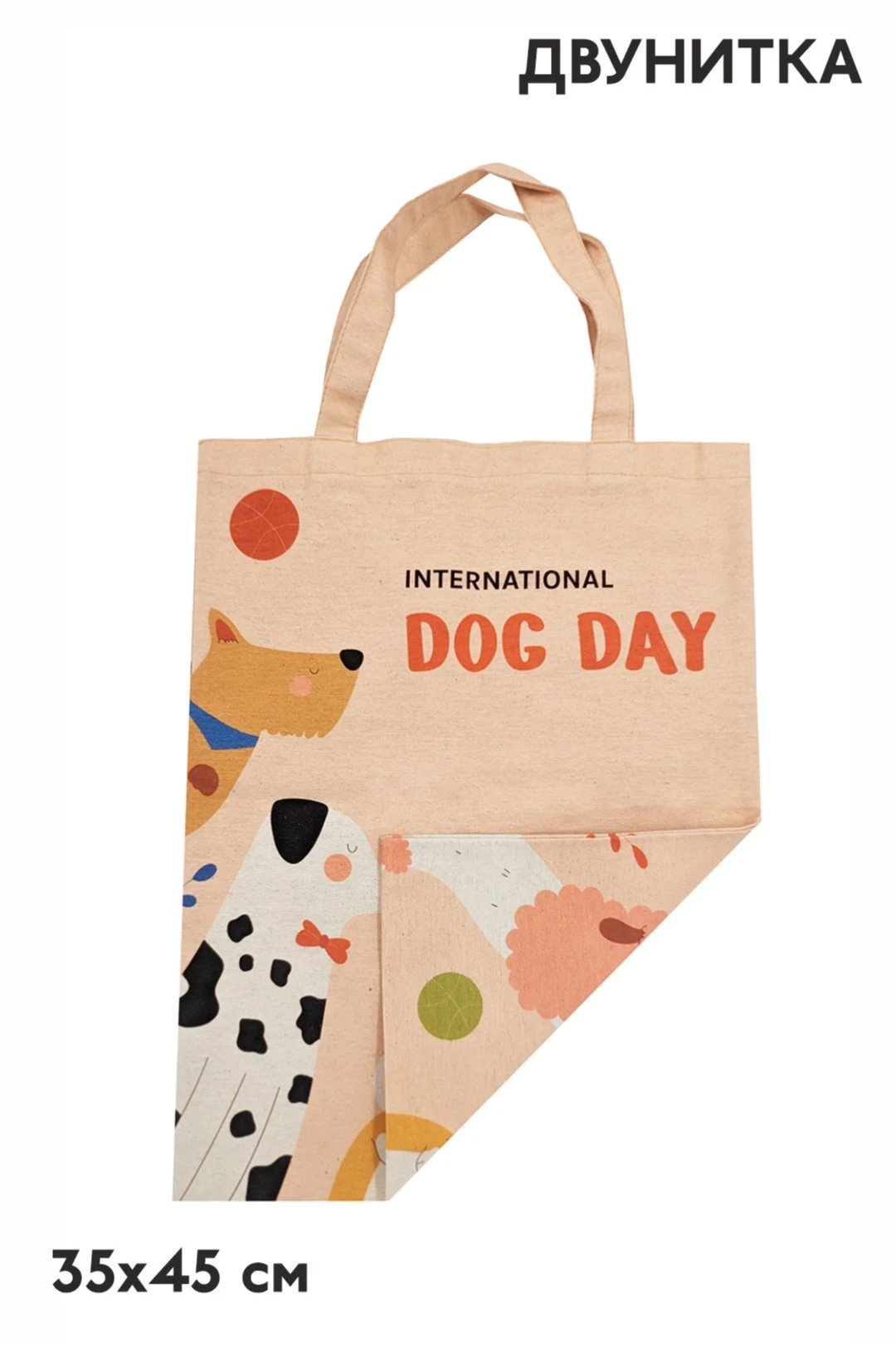 Печать с двух сторон: полноцветная печать осуществляется на хб материале с двух сторон по всей поверхности сумки, ручки сумки запечатываются фоновой заливкой без элементов дизайна.