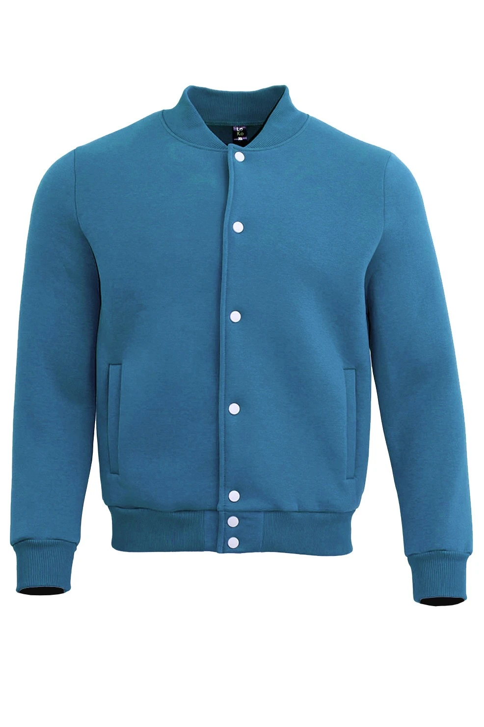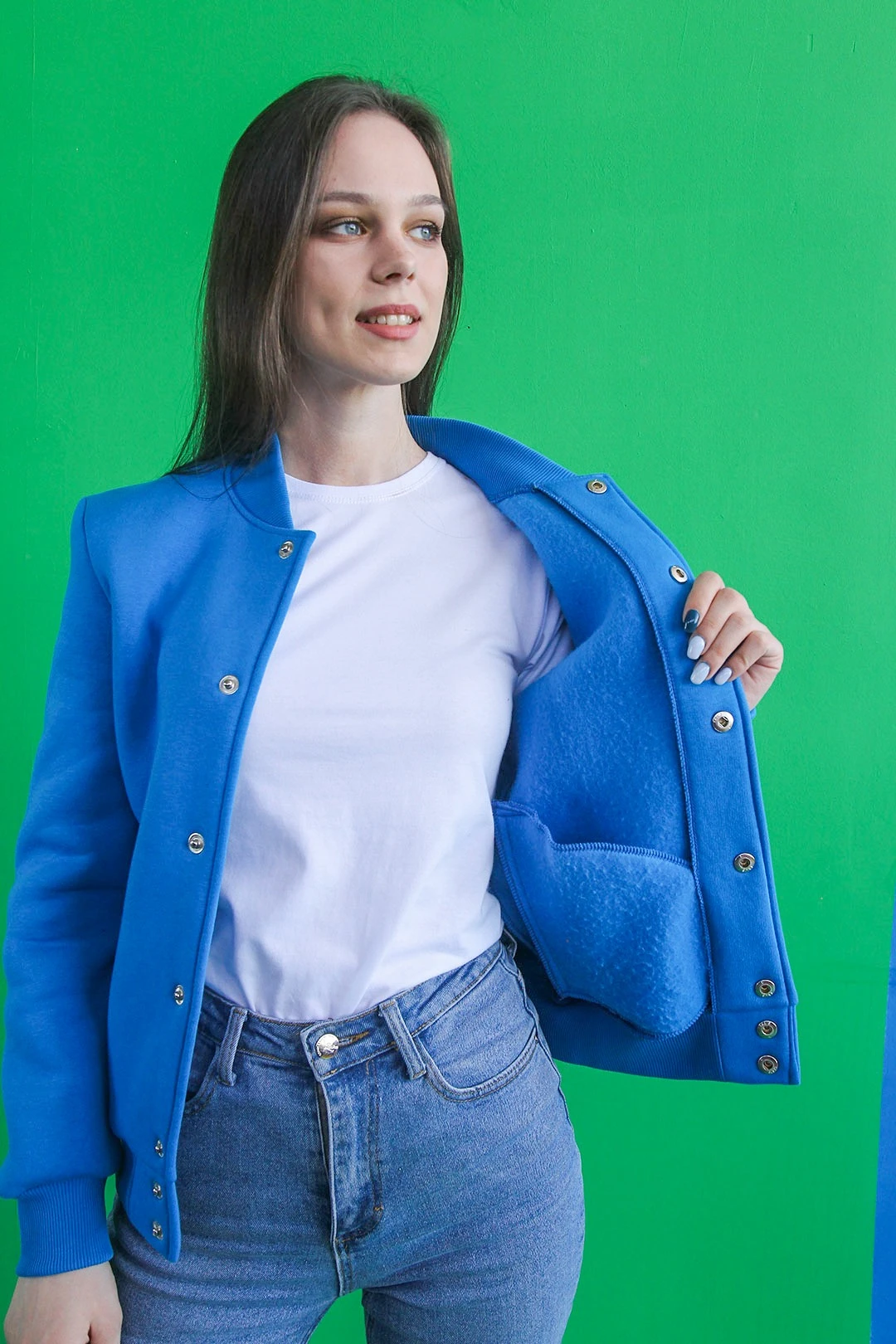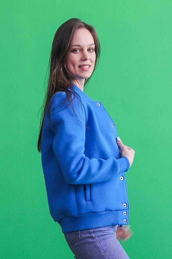 Модель. Бомбер прямого силуэта, без капюшона. Длинные рукава с манжетами из ткани футер с начесом. Низ бомбера и рукавов, а также воротник с закругленными углами выполнены из кашкорсе (специальная тканная резинка) в цвет изделия. Бомбер застегивается на семь кнопок. Имеет два боковых кармана в листочку без молнии.
