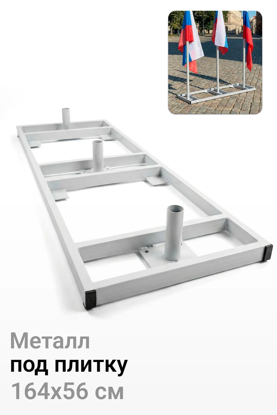 Основание прямоугольной формы для трех флагштоков выполнено из стали, окраска порошковая серого (RAL 7040) цвета.