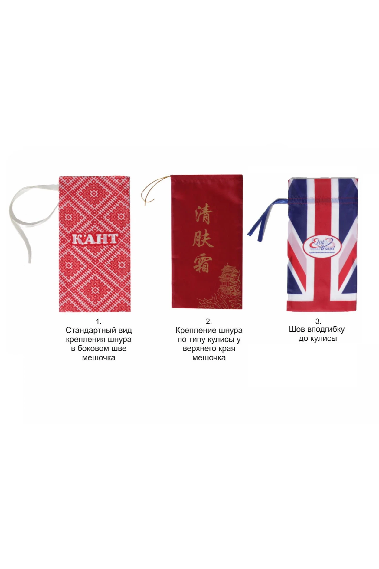 Крепление. Кулиса у верхнего края. Завязки из шнура (черного или белого цвета) или ленты сатиновой (шириной 1 см стандартных цветов). Верхний край мешочка обрабатывается прошивкой.