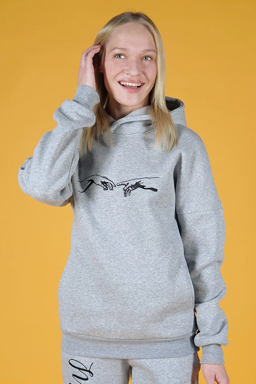 Модель. Худи Кинг прямого силуэта, без молнии. Длинные рукава со спущенной линией плеч. Имеет два кармана в боковом шве. Низ толстовки и рукавов обработаны тканью кашкорсе (специальная тканая резинка) в цвет толстовки. Капюшон пришивной двухслойный.