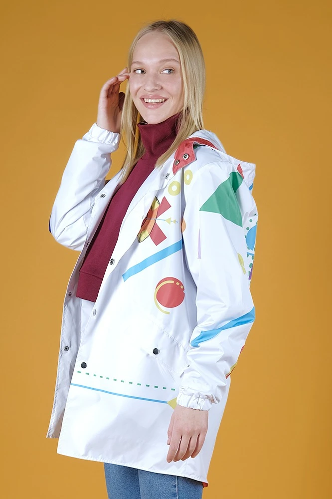 Модель. Ветровка прямого силуэта с длинным рукавом с манжетой на резинке. Пришивной капюшон затягивается резинкой с фиксаторами. Задняя часть удлинённая с фигурным низом. Ветровка застегивается на кнопки. Ветровка с подкладом из шелка расцвечивания стандартных цветов. Имеет два кармана с клапаном на кнопках.