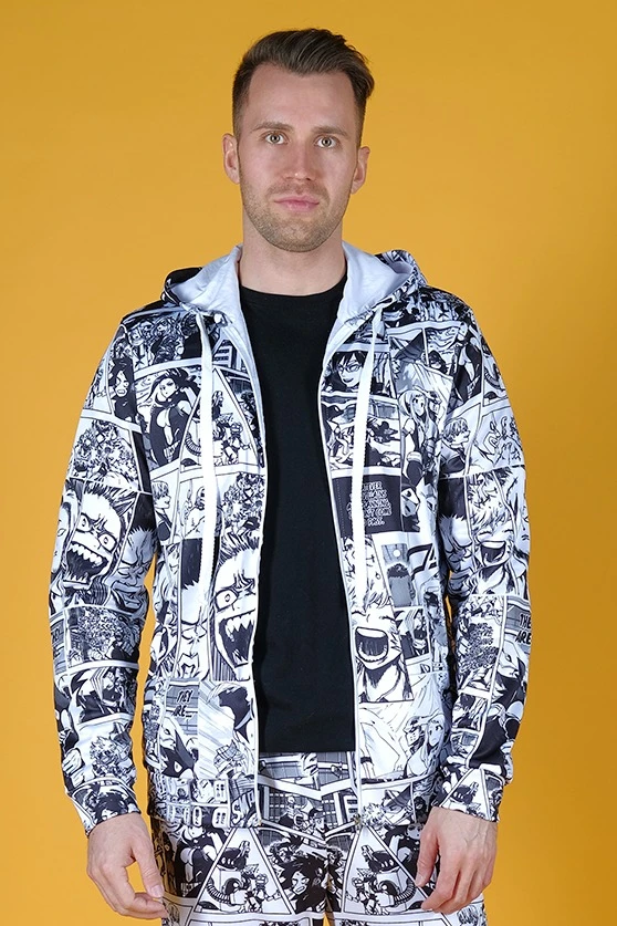 Модель. Прямой силуэт, балахон на молнии без подклада. Длинные рукава. Низ балахона и манжеты рукавов выполнены из сублимационной ткани сандвич браш. Два прорезных кармана в листочку. Капюшон пришивной двухслойный, внутренний слой из сублимационной кулирной глади. Рекомендуется выбрать кулирную гладь цвета меланж, универсален под любой дизайн. У края капюшона продет плоский шнур шириной 15 мм стандартных цветов.