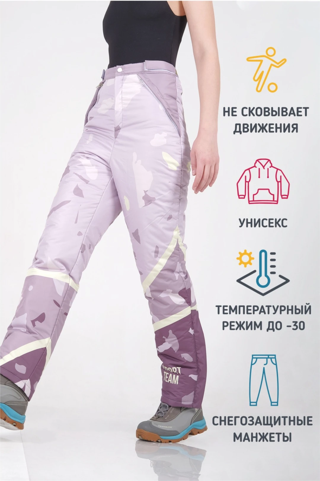 Модель: Брюки прямые утепленные синтепоном, с подкладом из шелка расцвечивания. Пояс с регулировкой на талии при помощи резинки. Ширина брюк регулируется вшитой боковой молнией, снегозащитные манжеты. Брюки с двумя боковыми кармами на молнии.