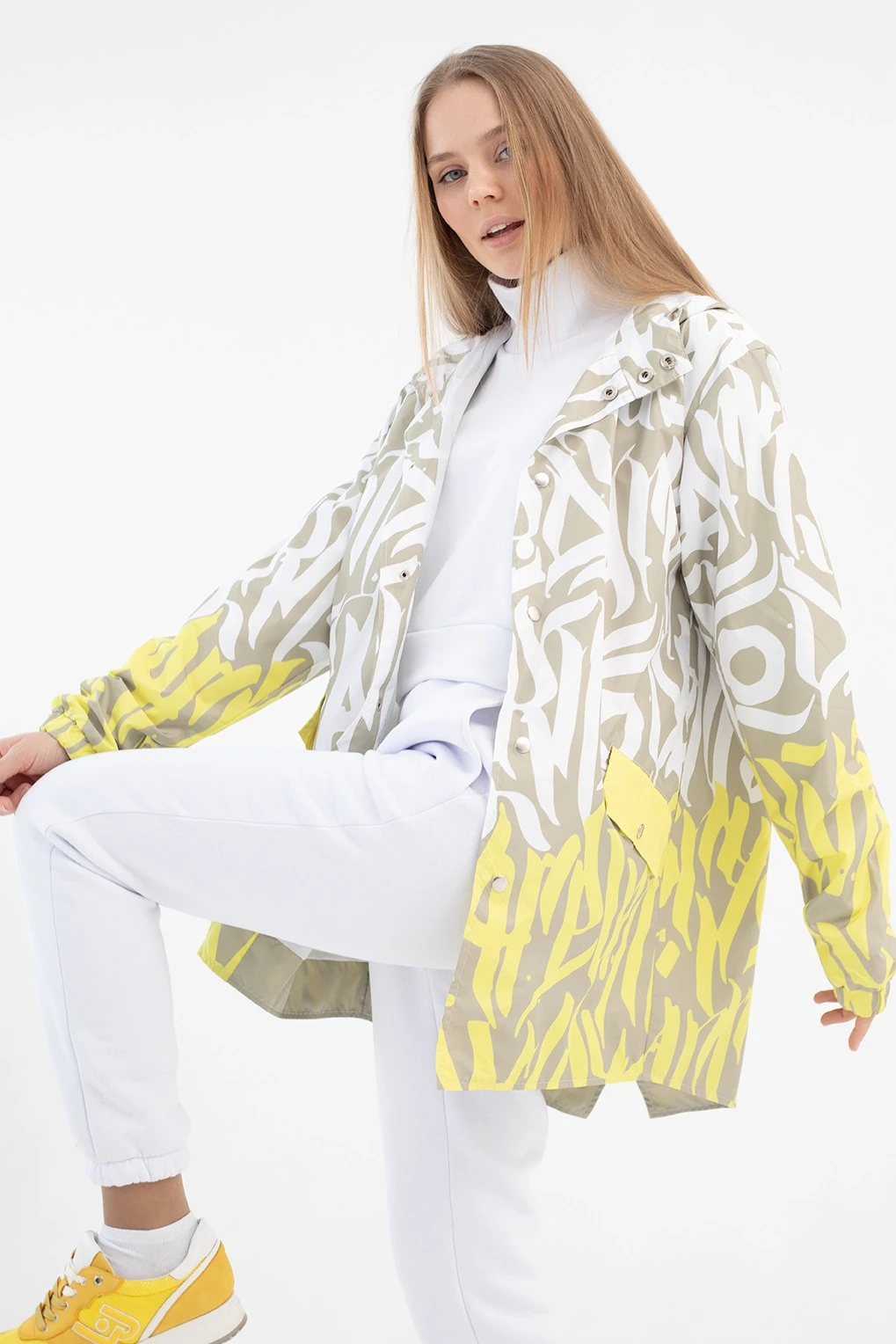 Модель. Ветровка прямого силуэта с длинным рукавом с манжетой на резинке. Пришивной капюшон затягивается резинкой с фиксаторами. Задняя часть удлинённая с фигурным низом. Ветровка застегивается на кнопки (9 шт). Ветровка с подкладом из шелка расцвечивания стандартных цветов. Имеет два кармана с клапаном на кнопках.