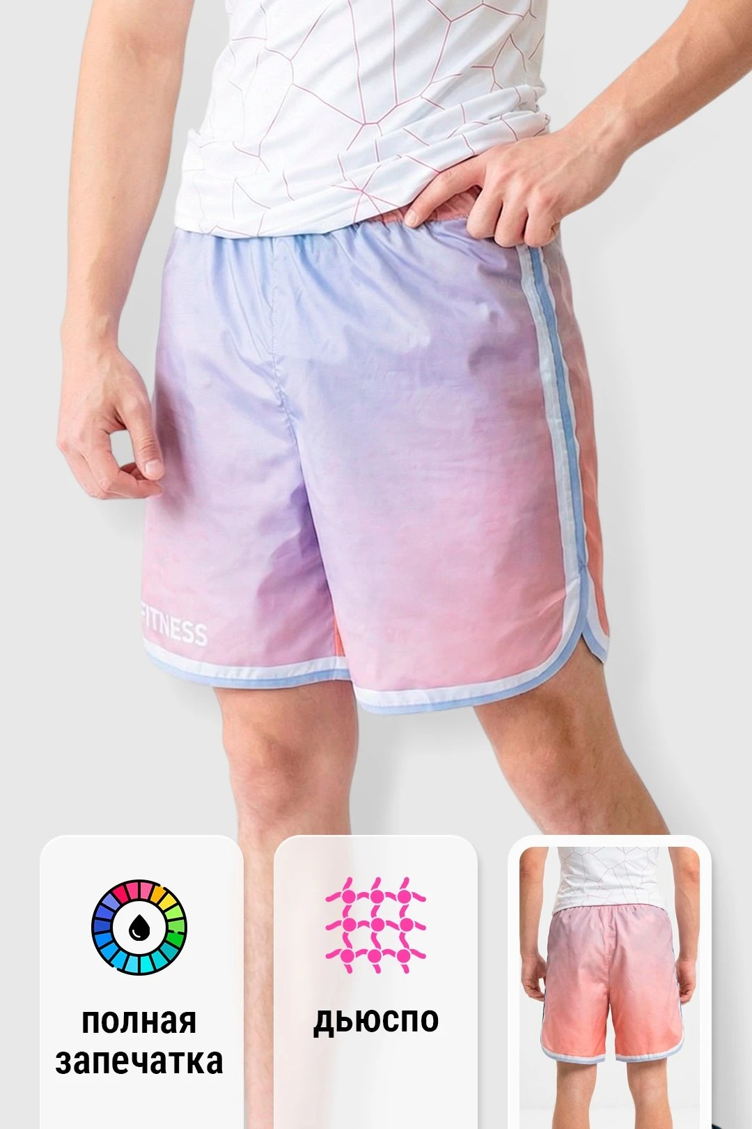 Особенности нанесения: Полноцветное нанесение осуществляется методом сублимации. Изображение размещается в соответствии с лекалом. Нанесение на шорты входит в стоимость шорт.