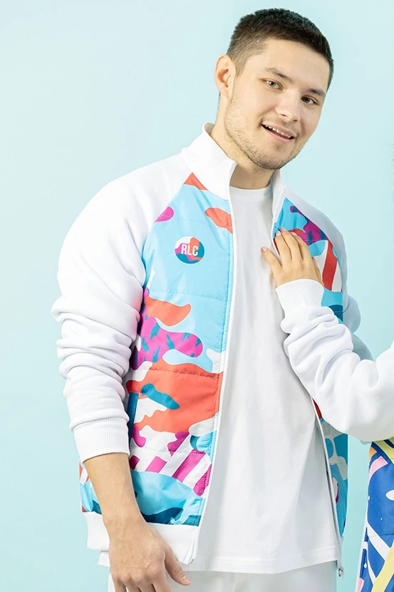 Модель. Толстовка прямого силуэта с рукавом реглан, имеет два прорезных кармана в листочку без молнии, полочка и спинка со стандартной стежкой. Без капюшона, застежка молния. Основной материал футер 3-х нитка с начесом стандартных цветов, полочка и спинка выполнены из дьюспо с полной запечаткой. Подклад из шелка расцвечивания стандартных цветов, имеет наполнитель из синтепона 60 гр. Воротник, манжеты рукавов и низ толстовки выполнены из кашкорсе стандартных цветов.