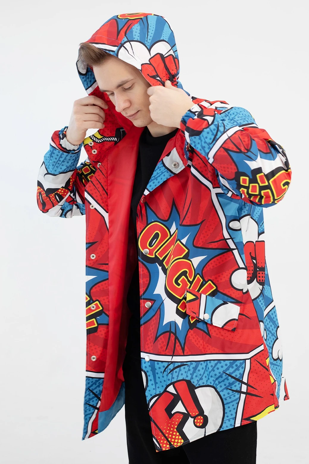 Модель. Ветровка прямого силуэта с длинным рукавом с манжетой на резинке. Пришивной капюшон затягивается резинкой с фиксаторами. Задняя часть удлинённая с фигурным низом. Ветровка застегивается на кнопки. Ветровка с подкладом из шелка расцвечивания стандартных цветов. Имеет два кармана с клапаном на кнопках.