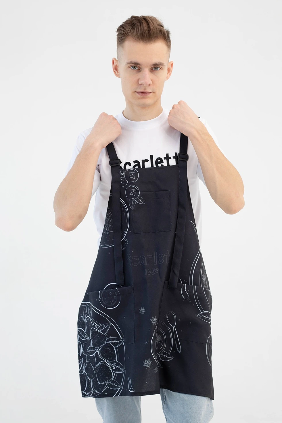 Модель: Фартук фигурной формы без разреза. Фартук по периметру обработан швом вподгибку. Фартук изготовлен с тремя карманами: два боковых 18х20 см и один карман на груди 13х12 см. Креплением служат перекрещивающиеся на спине лямки. Лямки из основной ткани фиксируются на груди с помощью двух пластиковых регуляторов черного цвета. В районе пояса лямки продеваются через два никелированных люверса диаметром 15 мм.