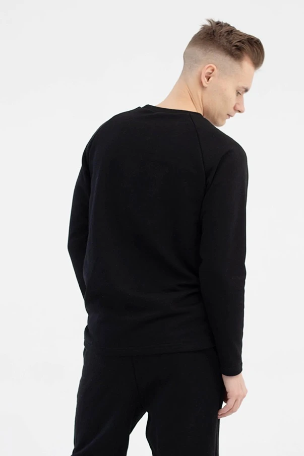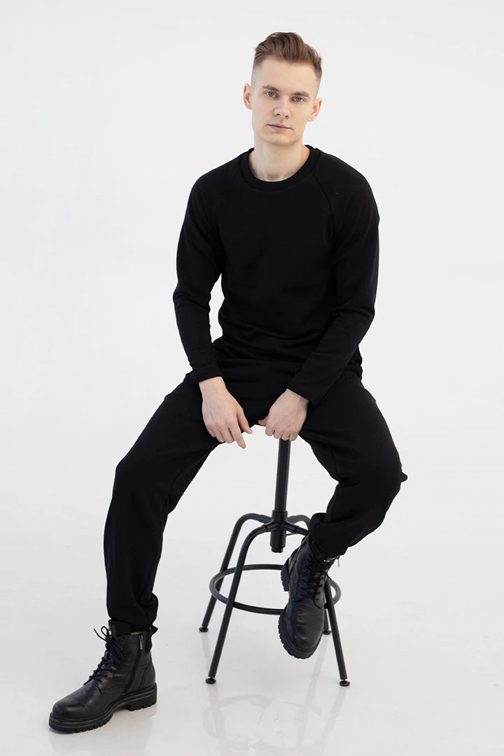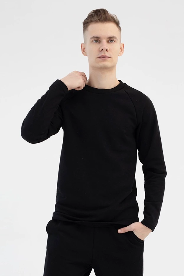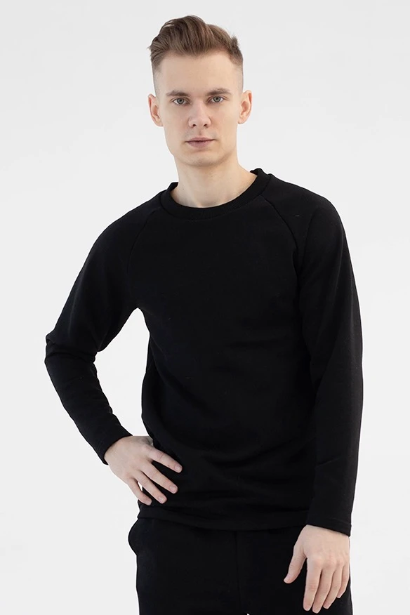 Модель. Лонгслив прямого силуэта, без молнии, рукав реглан длинный. Горловина обработана тканью кашкорсе (специальная тканная резинка) в цвет толстовки. Толстовка без капюшона и карманов.