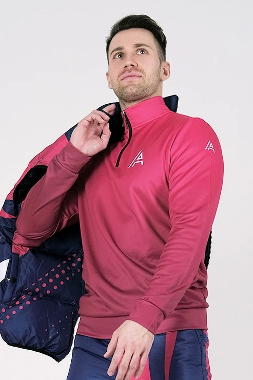 Модель. Толстовка Кейли прямого силуэта. Воротник стойка. Молния до груди толстовки. Длинные рукава с манжетой из основного материала. Толстовка без капюшона. Без карманов. Низ толстовки, манжеты рукавов и горловина выполнены из сублимационной ткани сандвич браш.