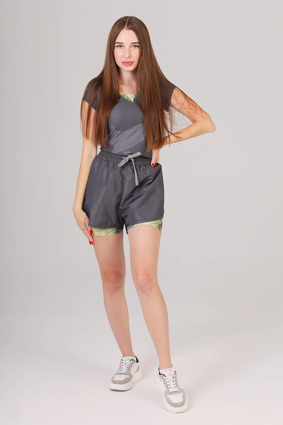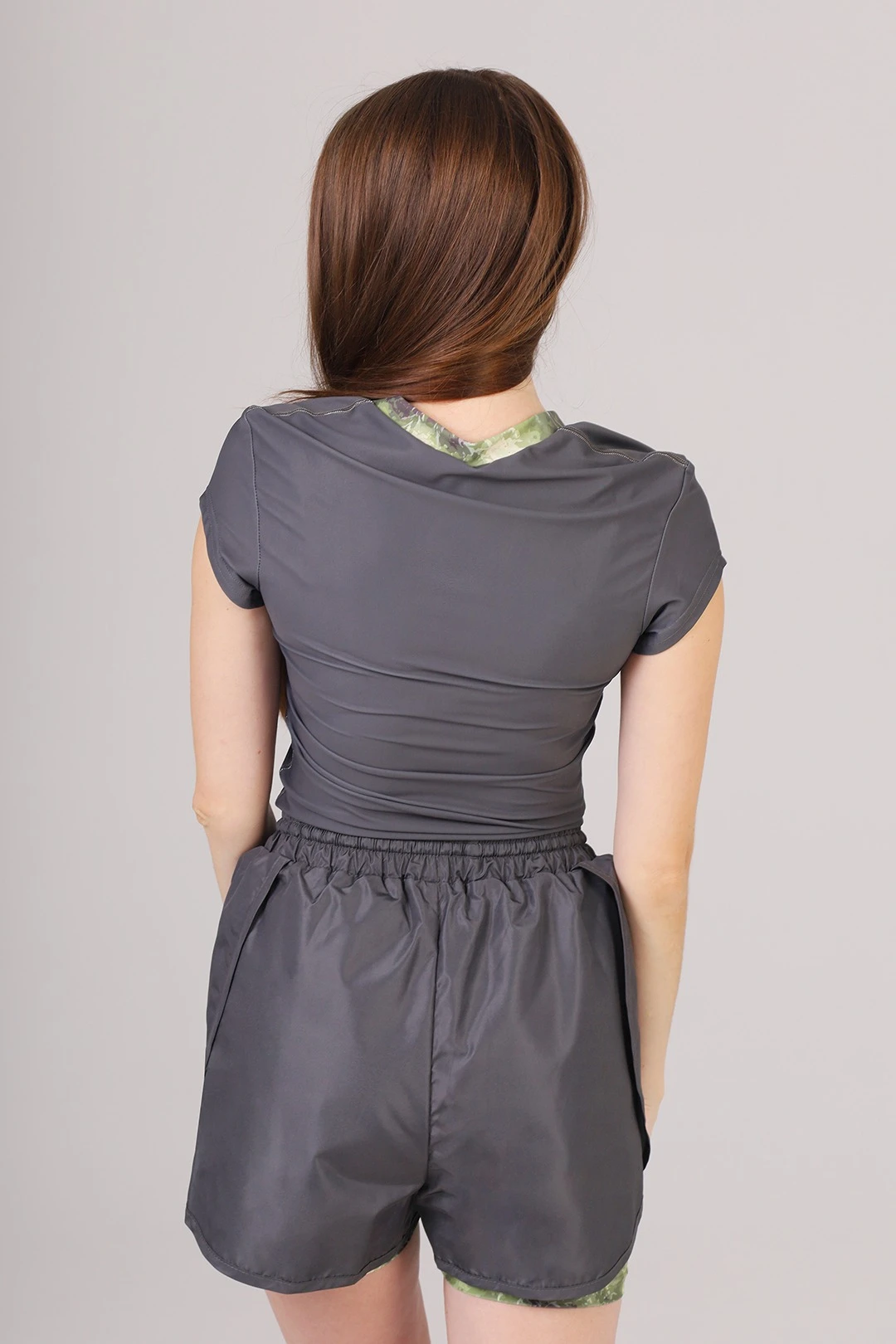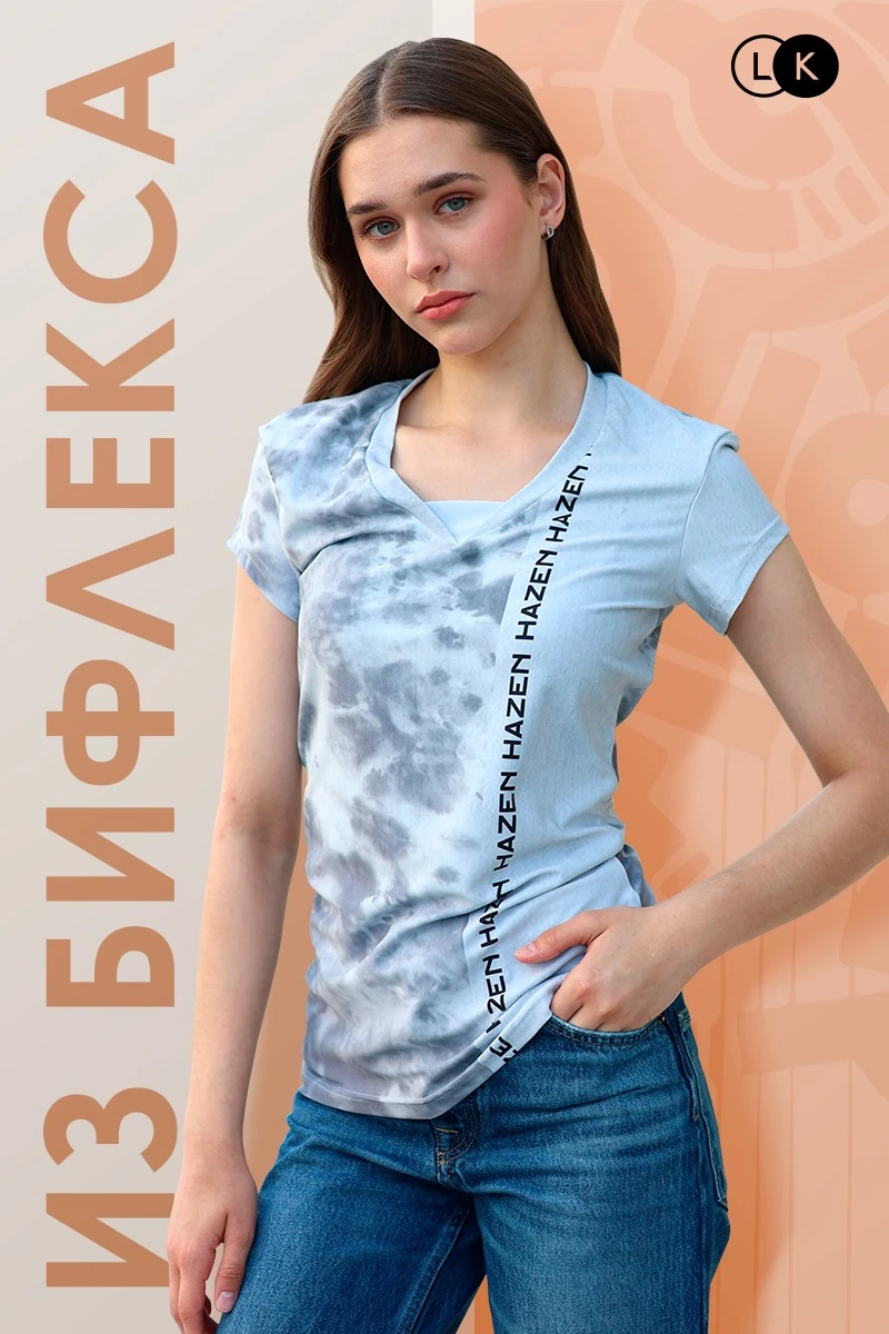 Модель. Футболка прилегающего силуэта с коротким рукавом. Форма ворота V-образная. Низ изделия и рукава обработан на плоскошовной машине. Обработка горловины руликом из основной ткани.
