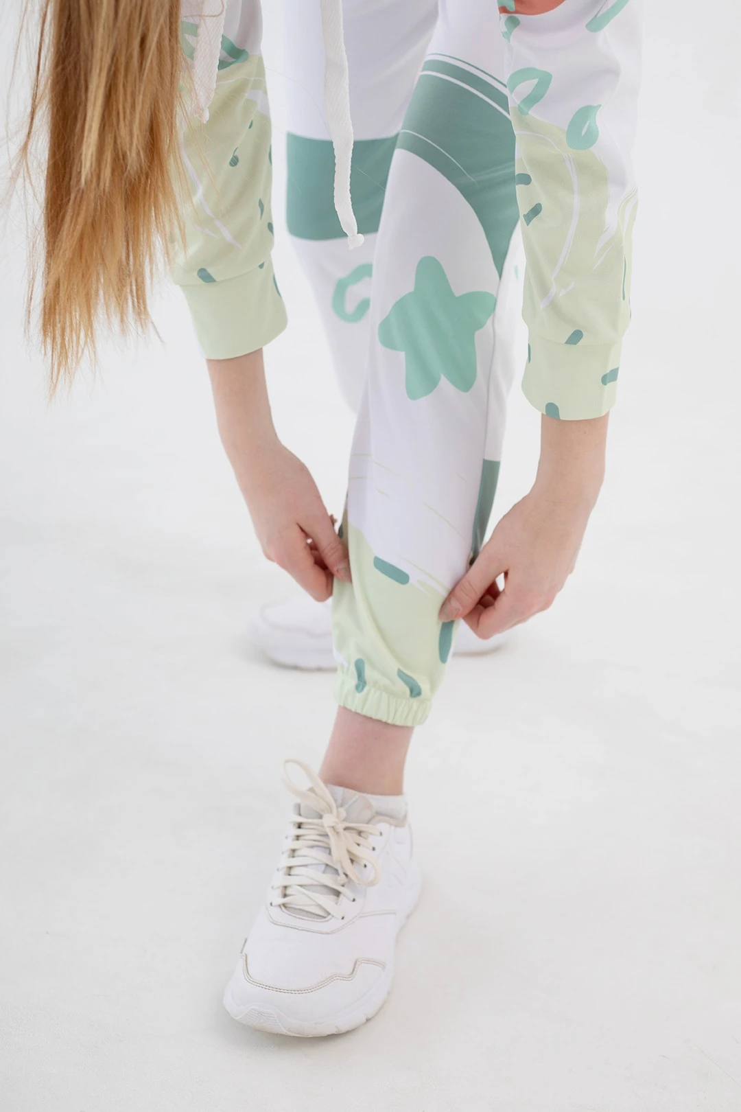 Брюки с двумя прорезными карманами в боковом шве без молнии, низ брюк прямой или на резинке, пояс на резинке.