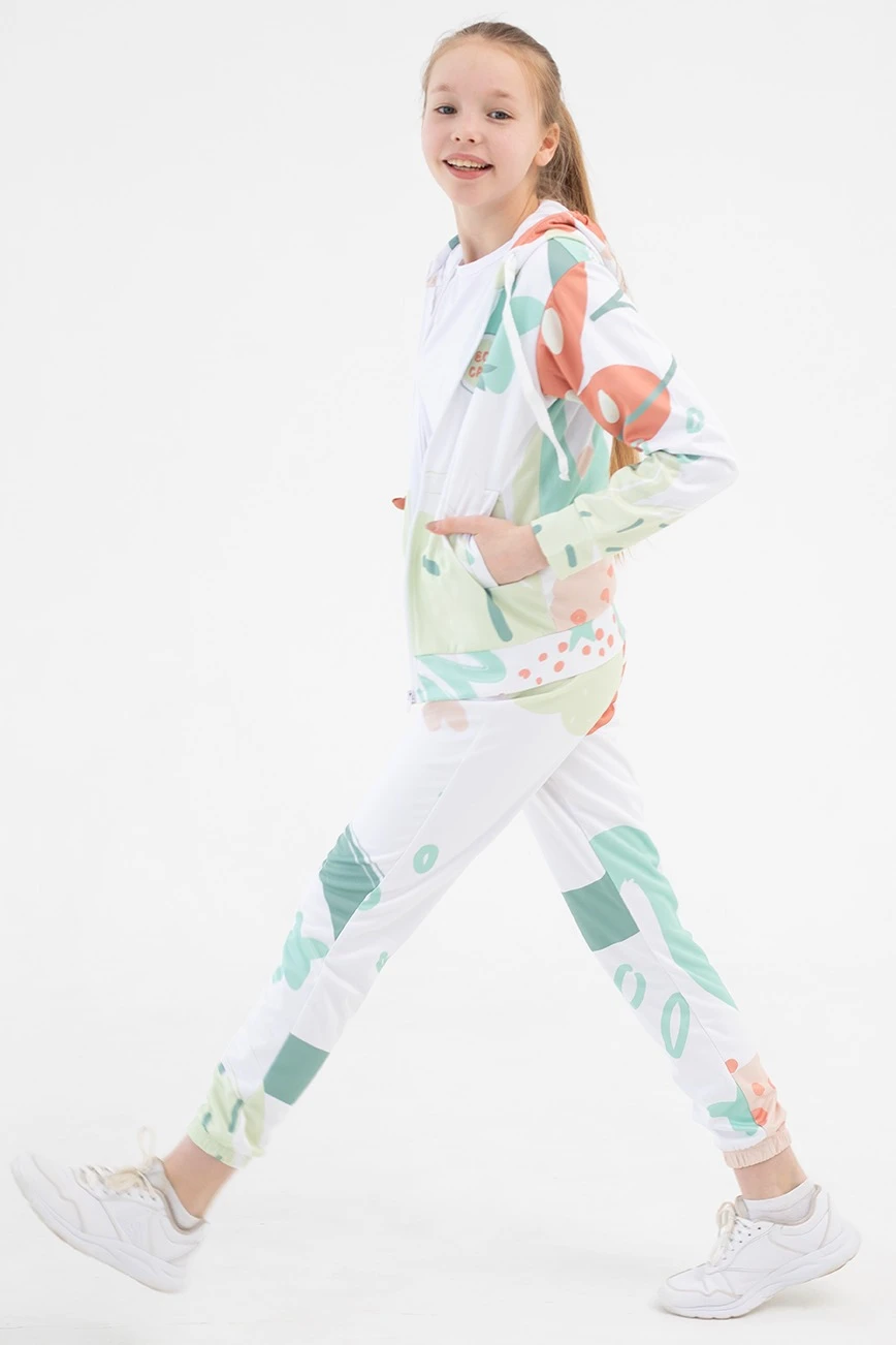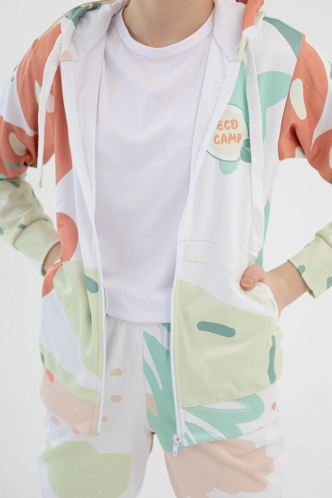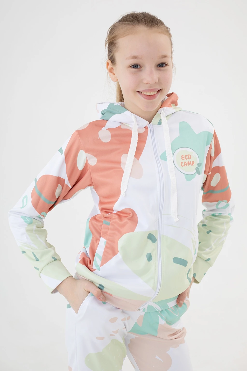 Толстовка. Прямой силуэт, балахон на молнии. Длинные рукава. Низ балахона и манжеты рукавов выполнены из сублимационной ткани прима. Два прорезных кармана в листочку. Капюшон пришивной двухслойный, внутренний слой из однотонной кулирной глади с лайкрой стандартных цветов на выбор.