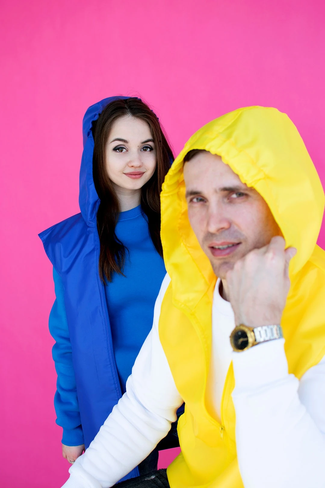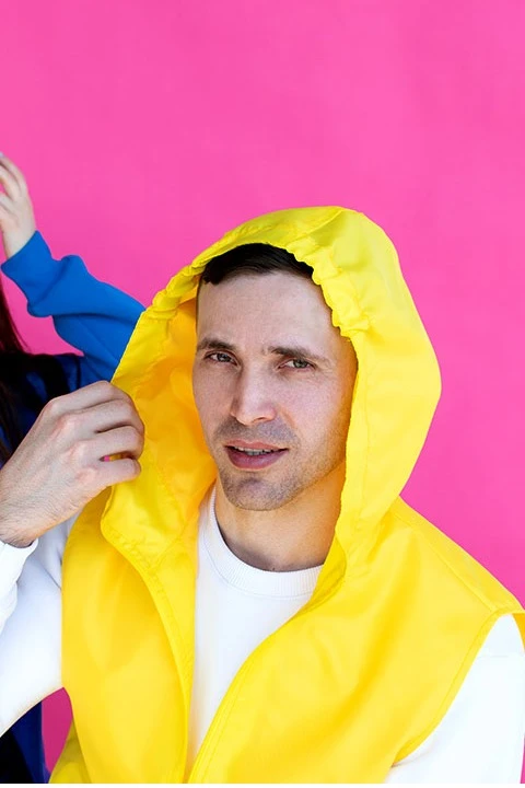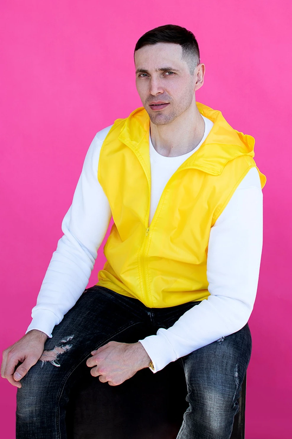 Модель. Жилет Профи унисекс с прямым силуэтом. Капюшон пришивной, на верхней части у края капюшона пришита резинка для удобства. Два прорезных кармана в листочку. Застегивается на молнию, Жилет без стежки с подкладом из шелка расцвечивания.
