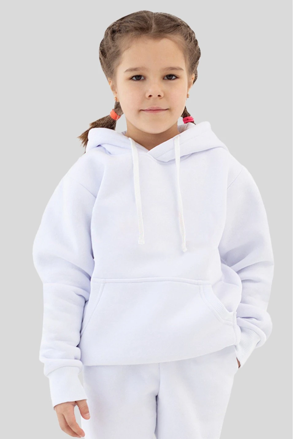 Модель. Толстовка прямого силуэта без молнии. Длинные рукава. Низ толстовки и рукавов обработаны тканью кашкорсе (специальная тканая резинка) в цвет толстовки. Один общий карман по типу кенгуру. Капюшон пришивной двухслойный, внутренний слой из однотонной кулирной глади с лайкрой стандартных цветов на выбор. У края капюшона продет плоский шнур стандартных цветов.