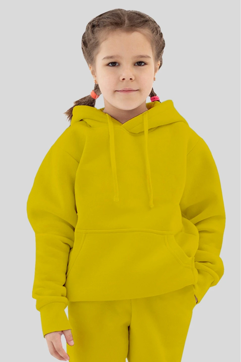 Модель. Толстовка прямого силуэта без молнии. Длинные рукава. Низ толстовки и рукавов обработаны тканью кашкорсе (специальная тканая резинка) в цвет толстовки. Один общий карман по типу кенгуру. Капюшон пришивной двухслойный, внутренний слой из однотонной кулирной глади с лайкрой стандартных цветов на выбор. У края капюшона продет плоский шнур стандартных цветов.