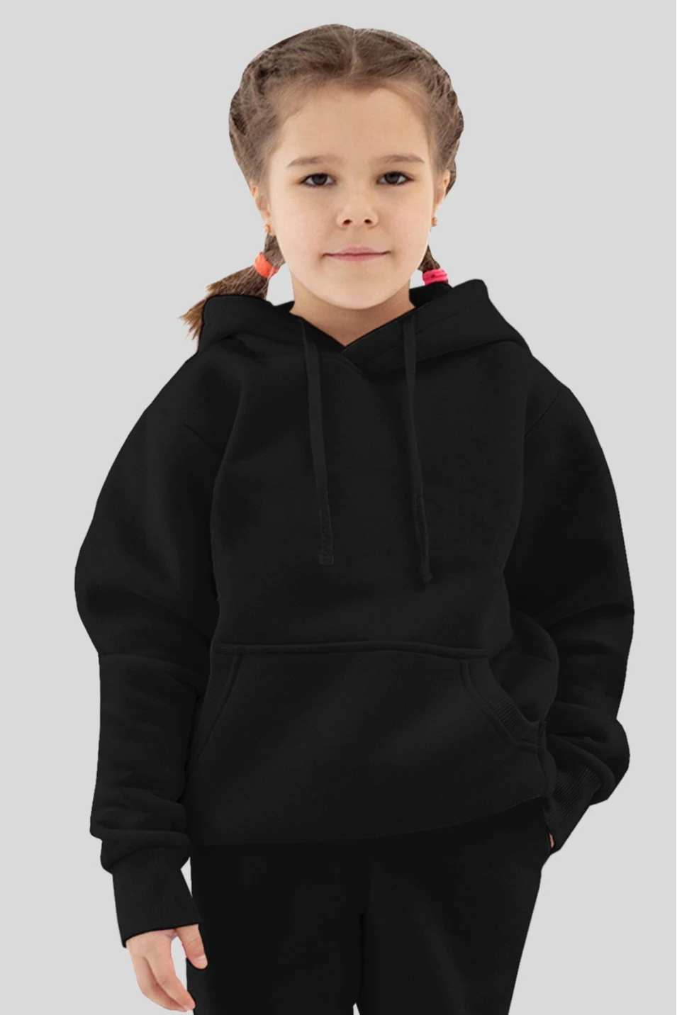 Модель. Толстовка прямого силуэта без молнии. Длинные рукава. Низ толстовки и рукавов обработаны тканью кашкорсе (специальная тканая резинка) в цвет толстовки. Один общий карман по типу кенгуру. Капюшон пришивной двухслойный, внутренний слой из однотонной кулирной глади с лайкрой стандартных цветов на выбор. У края капюшона продет плоский шнур стандартных цветов.