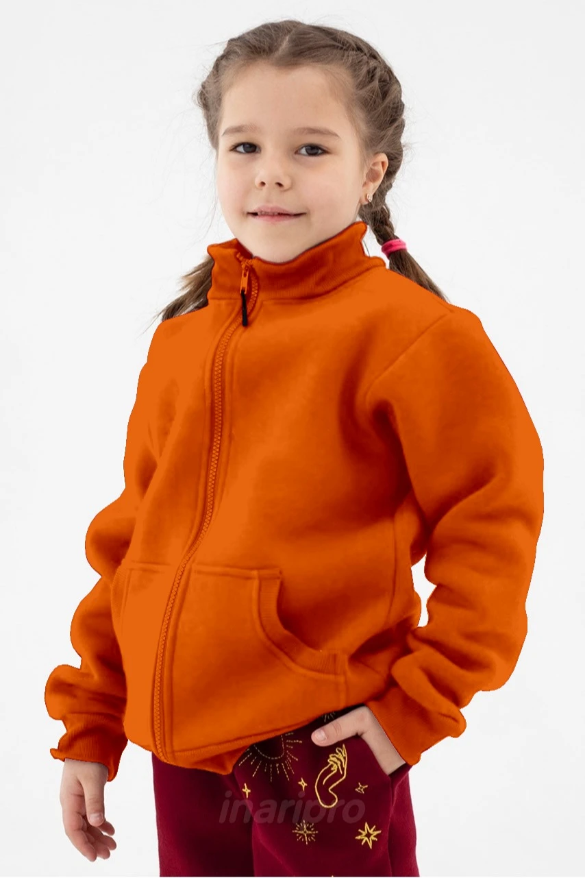 Модель. Прямой силуэт. Толстовка на молнии. Длинные рукава. Низ толстовки и рукавов, а также горловина обработаны тканью кашкорсе (специальная тканая резинка) в цвет толстовки. Толстовка без капюшона. Два раздельных кармана по типу кенгуру. Для большего удобства при открывании и закрывании на молнии установлены пуллеры.