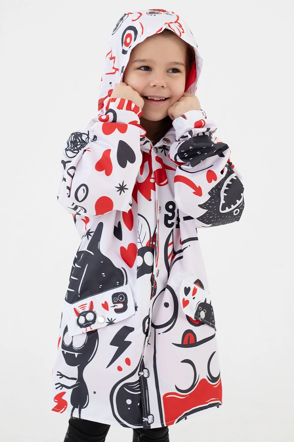 Модель. Ветровка прямого силуэта с длинным рукавом с манжетой на резинке. Пришивной капюшон затягивается резинкой с фиксаторами. Задняя часть удлинённая с фигурным низом. Ветровка застегивается на кнопки (9 шт). Ветровка с подкладом из шелка расцвечивания стандартных цветов. Имеет два кармана с клапаном на кнопках.
