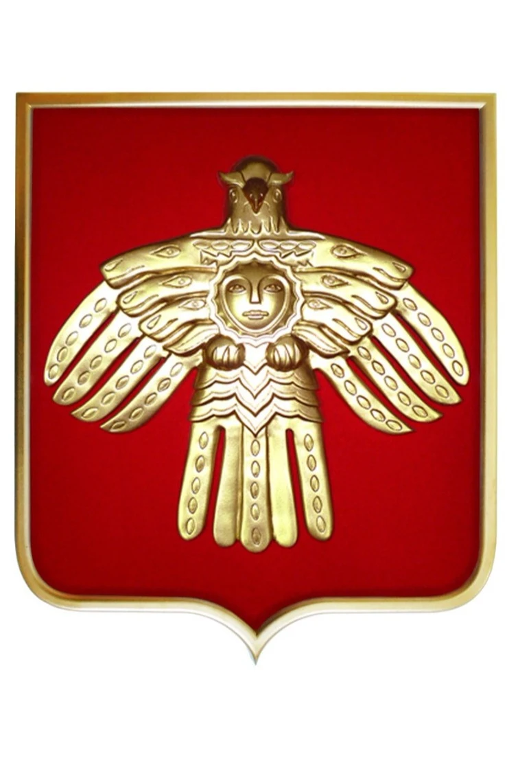 На гербе Республики Коми присутствует изображение, выполненное в так называемом пермском зверином стиле. С геральдического щита на нас смотрит золотая хищная птица. Ее грудь закрыта солнцем в виде женского лика, который окружают головы лосей. Столь необычный образ, изображенный на гербе Республики Коми, содержит глубокий смысл, понятный людям, знакомым с древней местной мифологией.