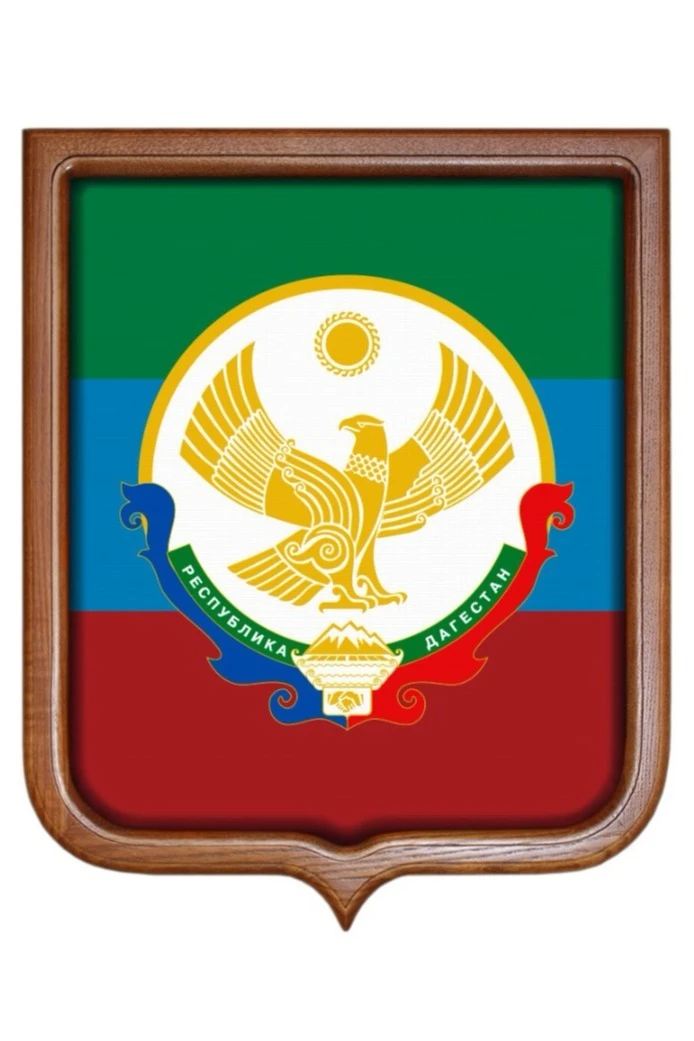 На гербе Дагестана в центре белого круга изображен золотистый орел с расправленными по сторонам крыльями. Над его головой находится такого же цвета солнце, обрамляет которое спиральный орнамент. По центру нижней части круга на зеленой ленте нанесена надпись «Республика Дагестан». Между этими двумя словами располагается совокупное изображение величественных гор, моря и равнины.