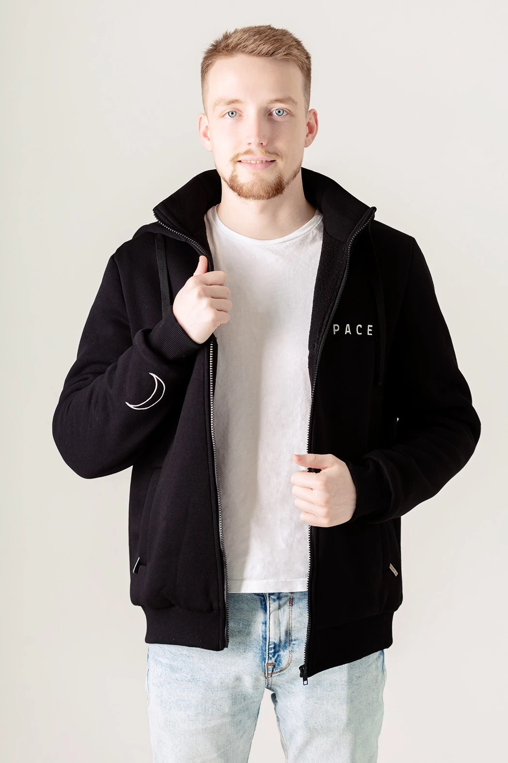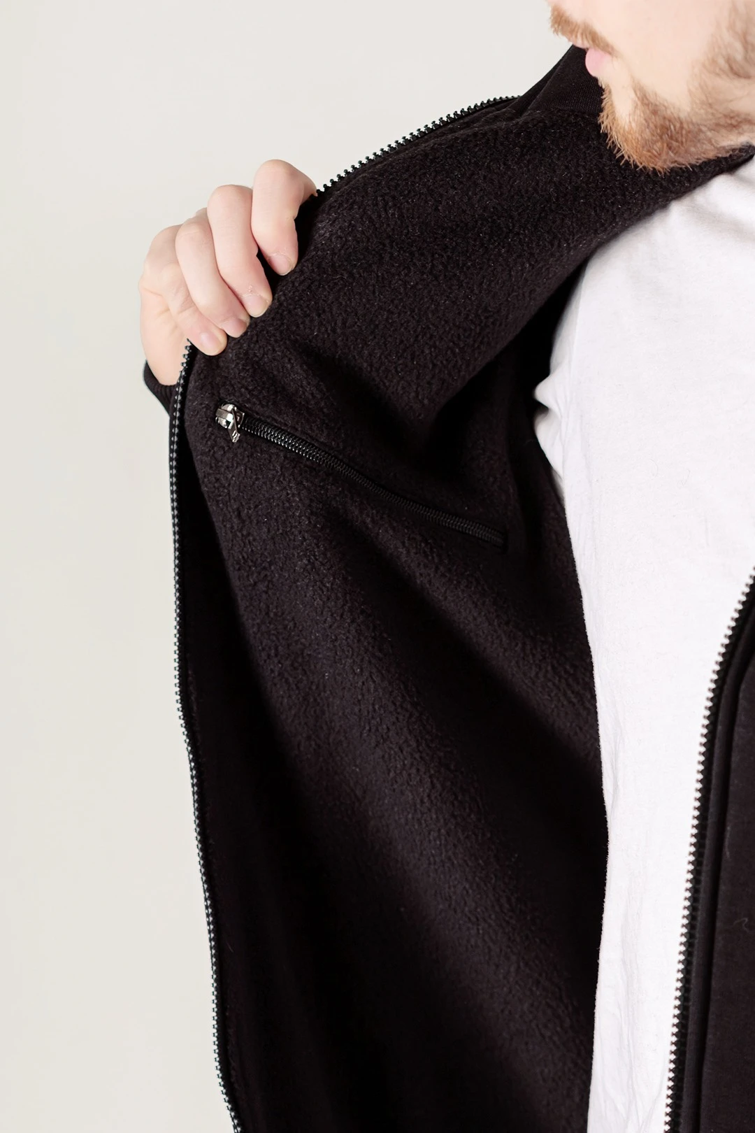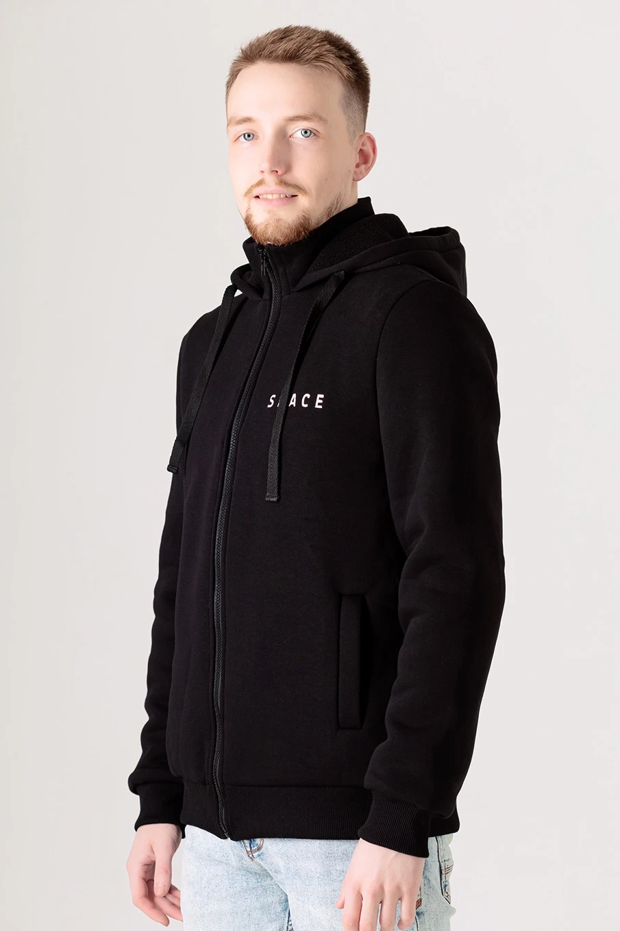 Модель. Балахон Джеймс прямого силуэта на молнии. Выполнен из двух слоев ткани. Верхний слой из футера, внутренний слой выполнен из флиса. Толстовка с длинными рукавами. По низу толстовки и рукавов прошита специальная тканная резинка кашкорсе в цвет балахона. Два прорезных кармана в листочку на молнии и два внутренних кармана на молнии. Капюшон пришивной двухслойный. У края капюшона продет плоский шнур шириной 15 мм стандартных цветов.