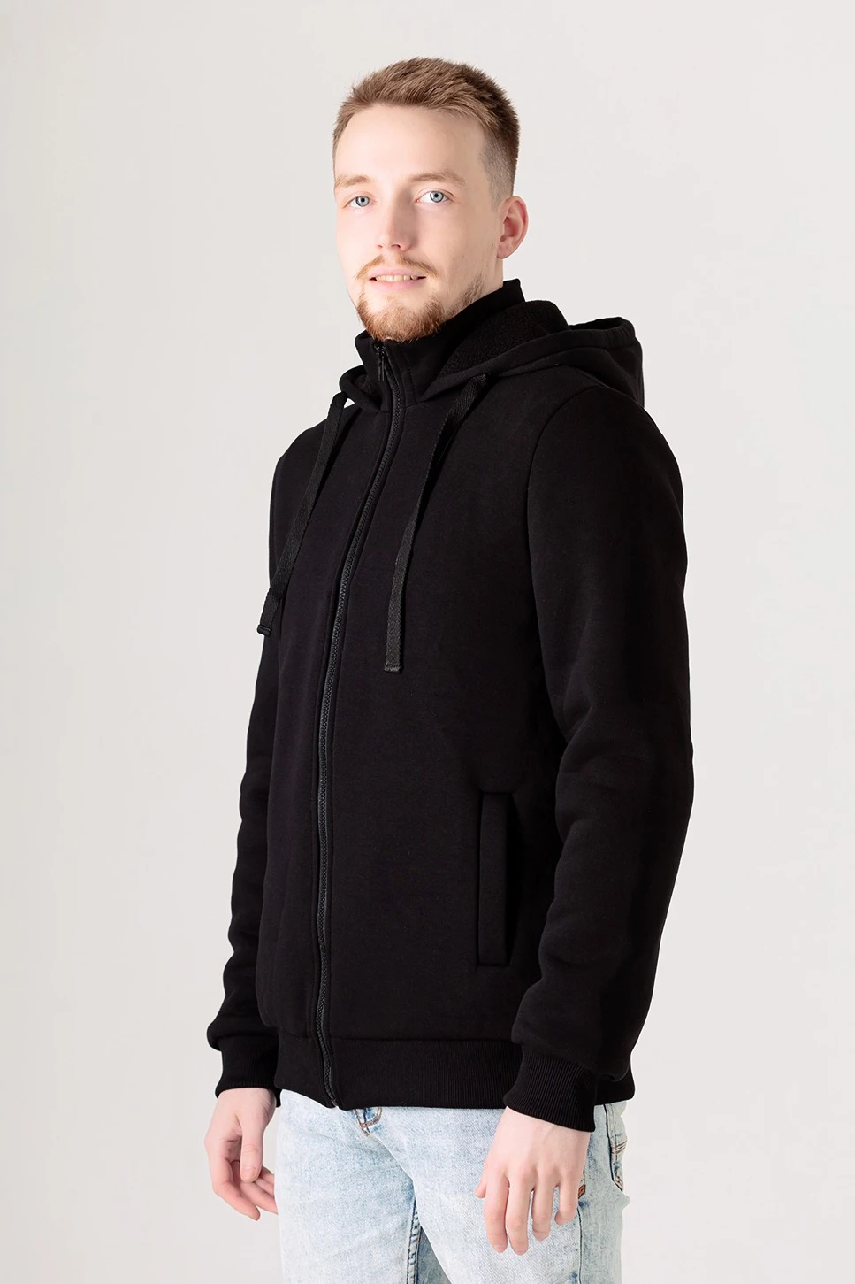 Модель. Балахон Джеймс прямого силуэта на молнии. Выполнен из двух слоев ткани. Верхний слой из футера, внутренний слой выполнен из флиса. Толстовка с длинными рукавами. По низу толстовки и рукавов прошита специальная тканная резинка кашкорсе в цвет балахона. Два прорезных кармана в листочку на молнии и два внутренних кармана на молнии. Капюшон пришивной двухслойный. У края капюшона продет плоский шнур стандартных цветов. Для большего удобства при открывании и закрывании на молнии установлены пуллеры.