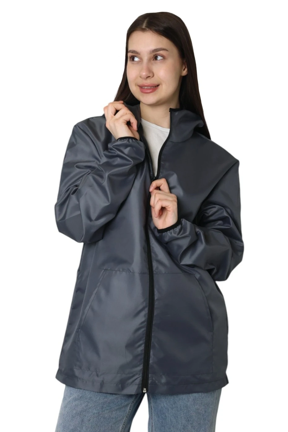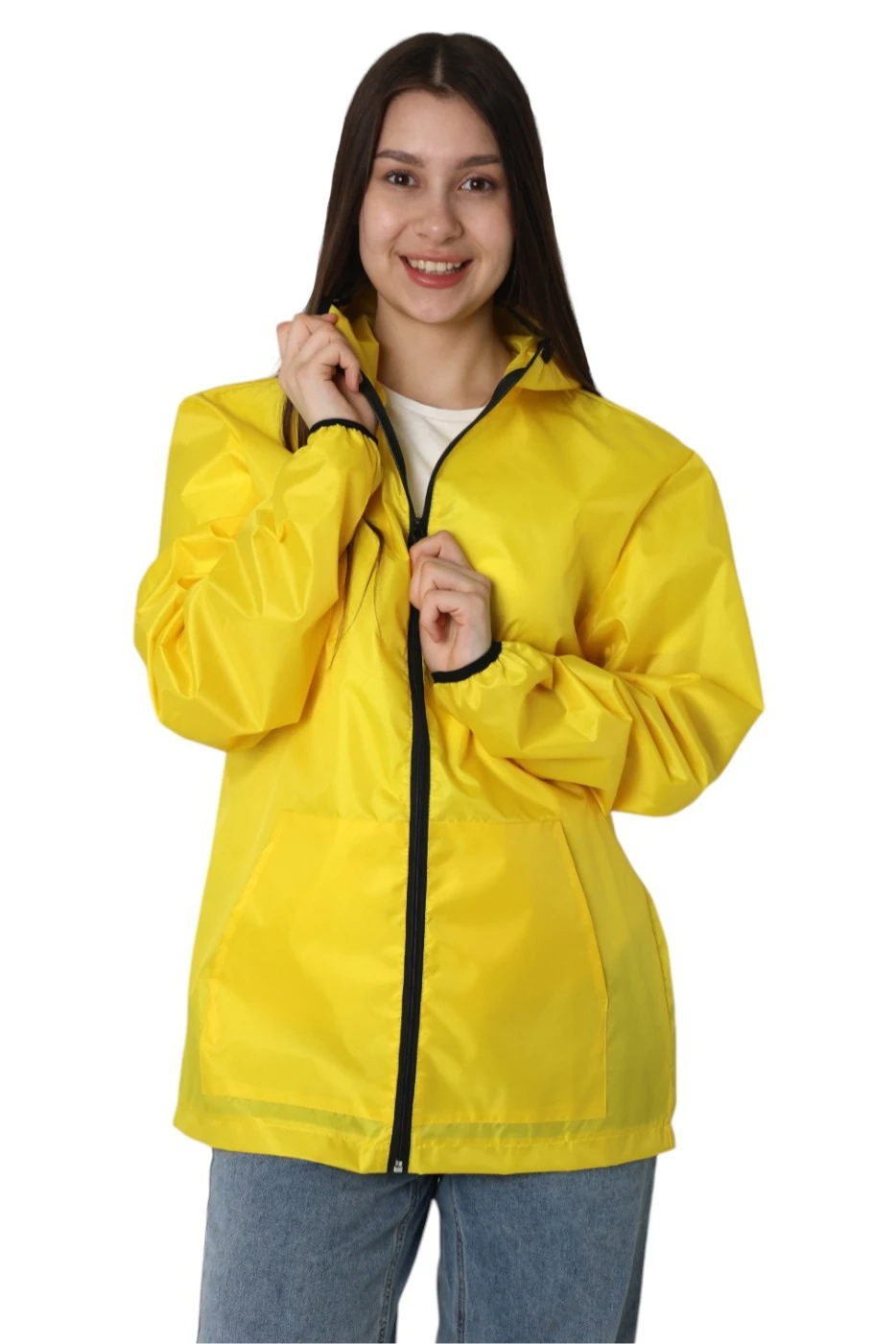 Модель. Ветровка Арчи прямого силуэта с притачным капюшоном. Застегивается спереди на молнию спираль чёрного цвета. Карманы накладные по типу кенгуру. Рукава втачные. Низ рукава и край капюшона обработан черной окантовочной резинкой.