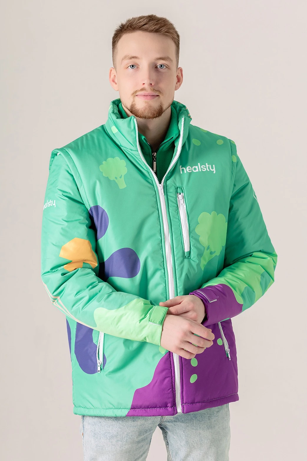 Куртка-жилет Фрост практичный вариант элемента гардероба два в одном. Куртка трансформируется в жилет благодаря съемным рукавам на молнии. По заказу клиентов мы размещаем на куртках цветные изображения, надписи и логотипы.