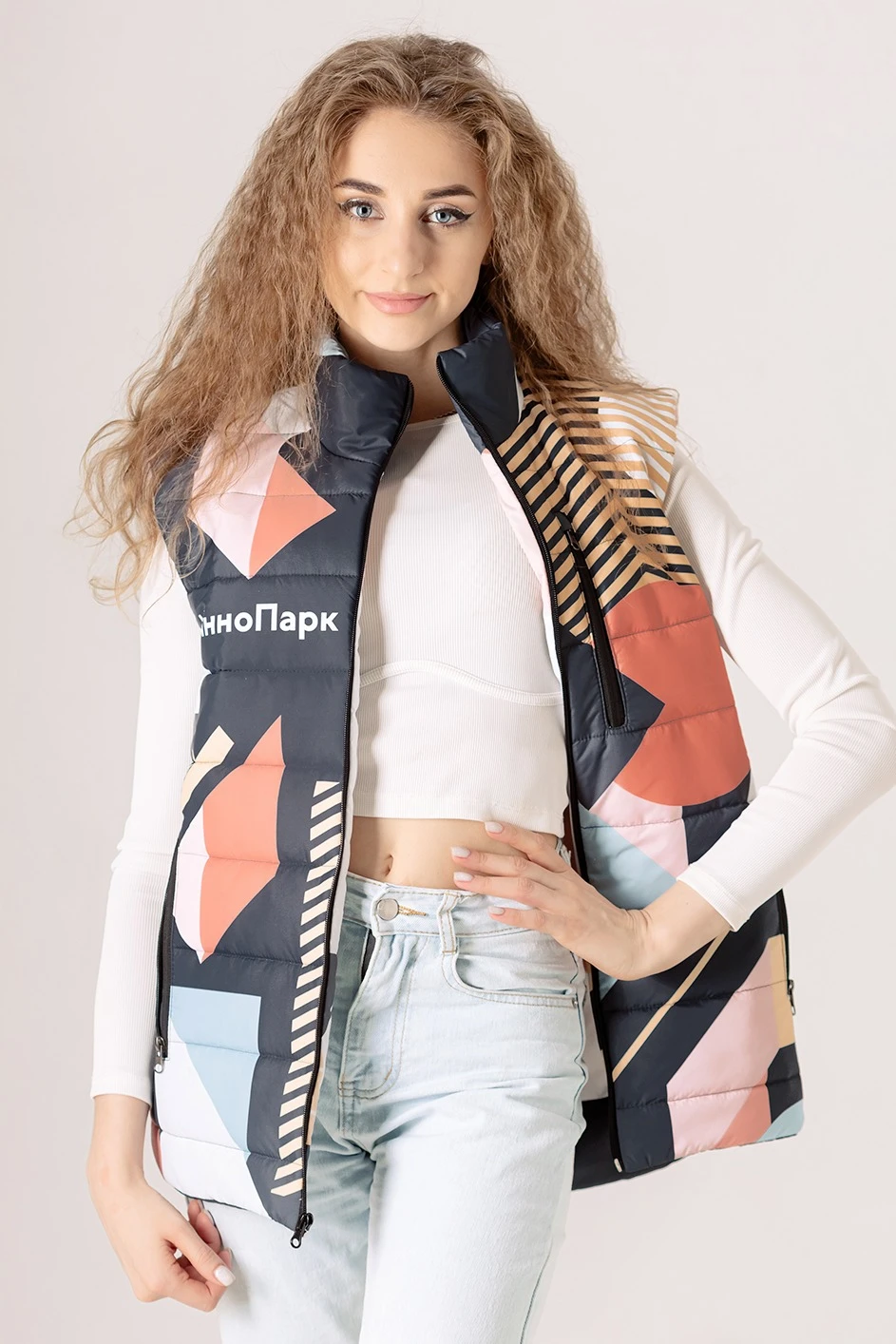 Модель: Жилет Бостон прямого силуэта утепленный синтепоном 200 гр., с подкладом из дешайна с полной запечаткой. Стежка по спинке и полочке, спинка удлиненная. Имеет три кармана в рамку на молнии. Воротник стойка. Застегивается на реверсивную молнию.