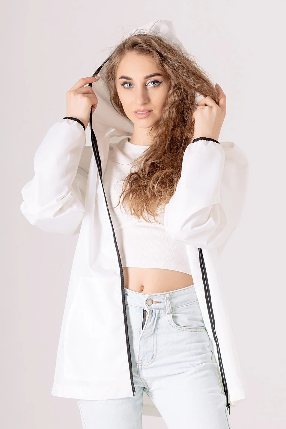 Модель. Ветровка Арчи прямого силуэта с притачным капюшоном. Застегивается спереди на молнию спираль чёрного цвета. Карманы накладные по типу кенгуру. Рукава втачные. Низ рукава и край капюшона обработан черной окантовочной резинкой.