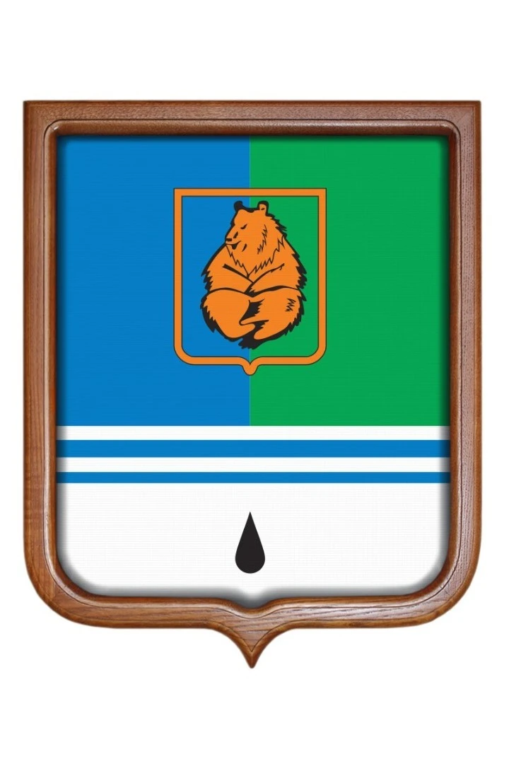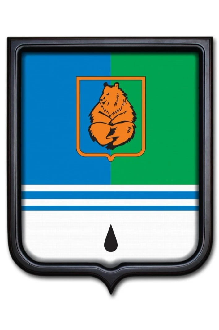 Герб города Когалыма выглядит следующим образом. Это остроконечный геральдический щит, разделенный на несколько частей. Верхняя часть двухцветная: слева - синяя, справа - зеленая. На границе цветов изображен в золотом контуре золотой же медведь со сложенными лапами. Нижняя часть белого цвета. Ее пересекают две синие линии, а у острого конца щита изображена черная капля нефти.