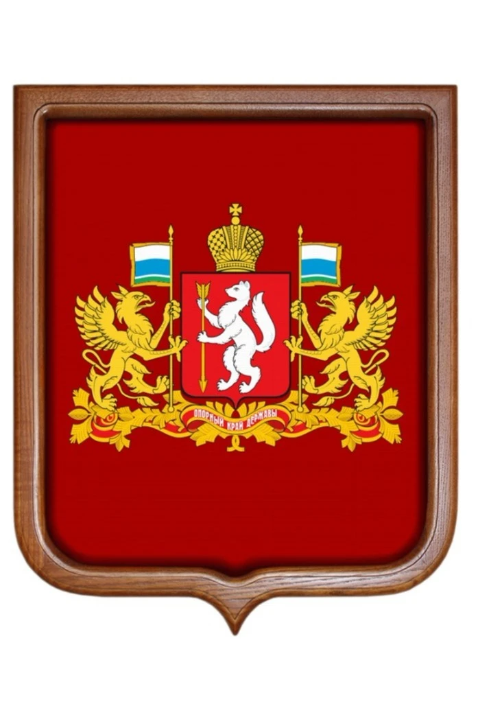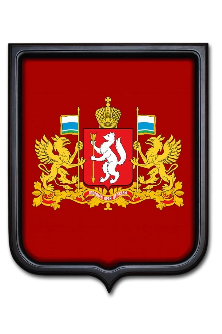 Герб Свердловской области выполнен в виде красного геральдического щита французской формы. В самом центре герба изображен стоящий в вертикальном положении соболь, который в своих передних лапах держит золотую стрелу. По обеим сторонам от него находятся золотые грифоны с флагами - символами Свердловской области. Под щитом проходит красная с золотым контуром лента с надписью "Опорный край державы". Увенчивает щит золотая императорская корона.