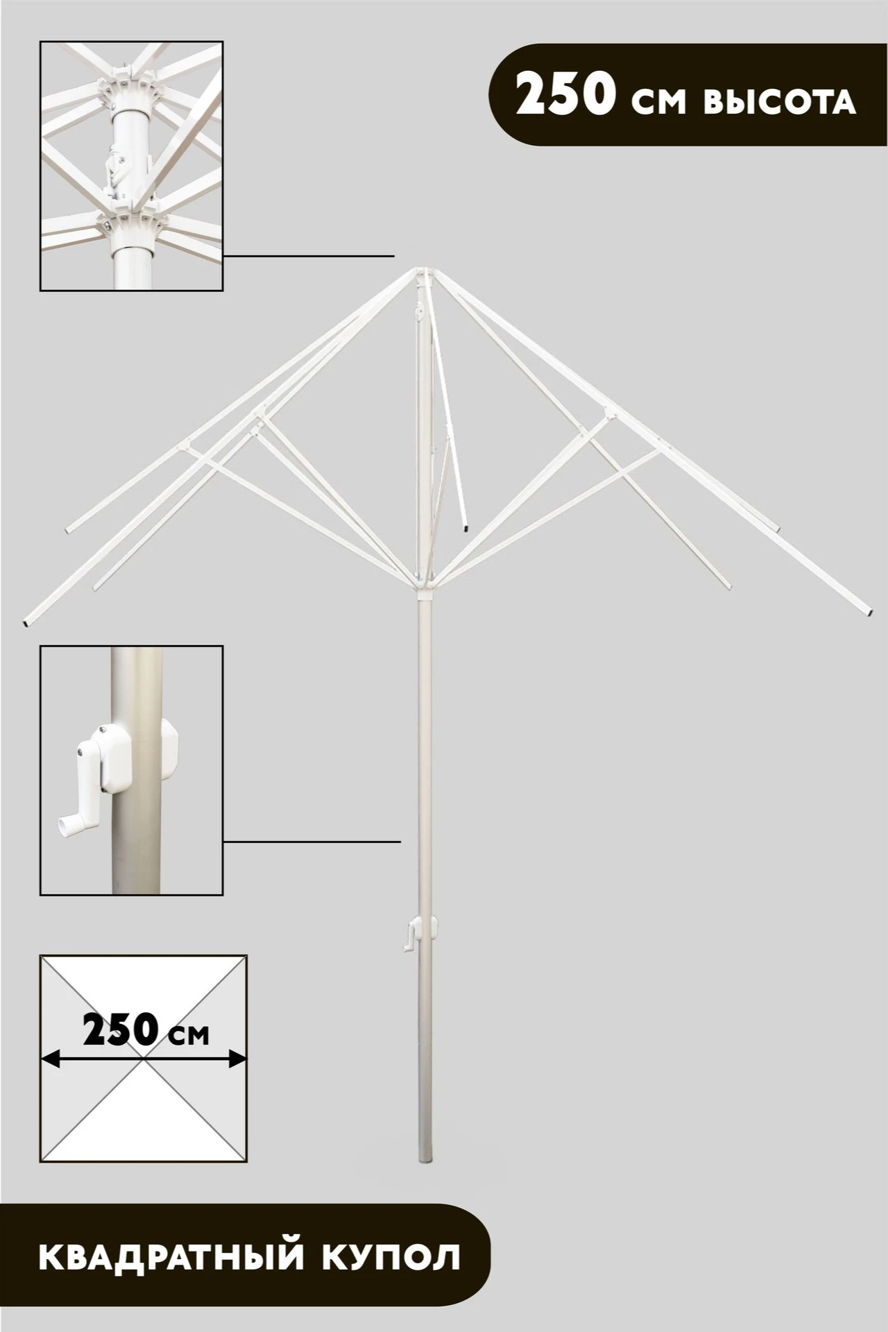 Размеры: Квадратный купол - 2,5х2,5 м, количество спиц – 8 шт. Высота в собранном виде без основания 2,5 м.