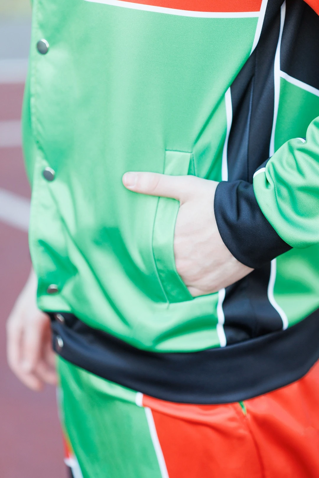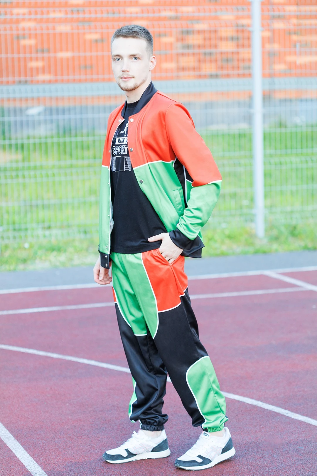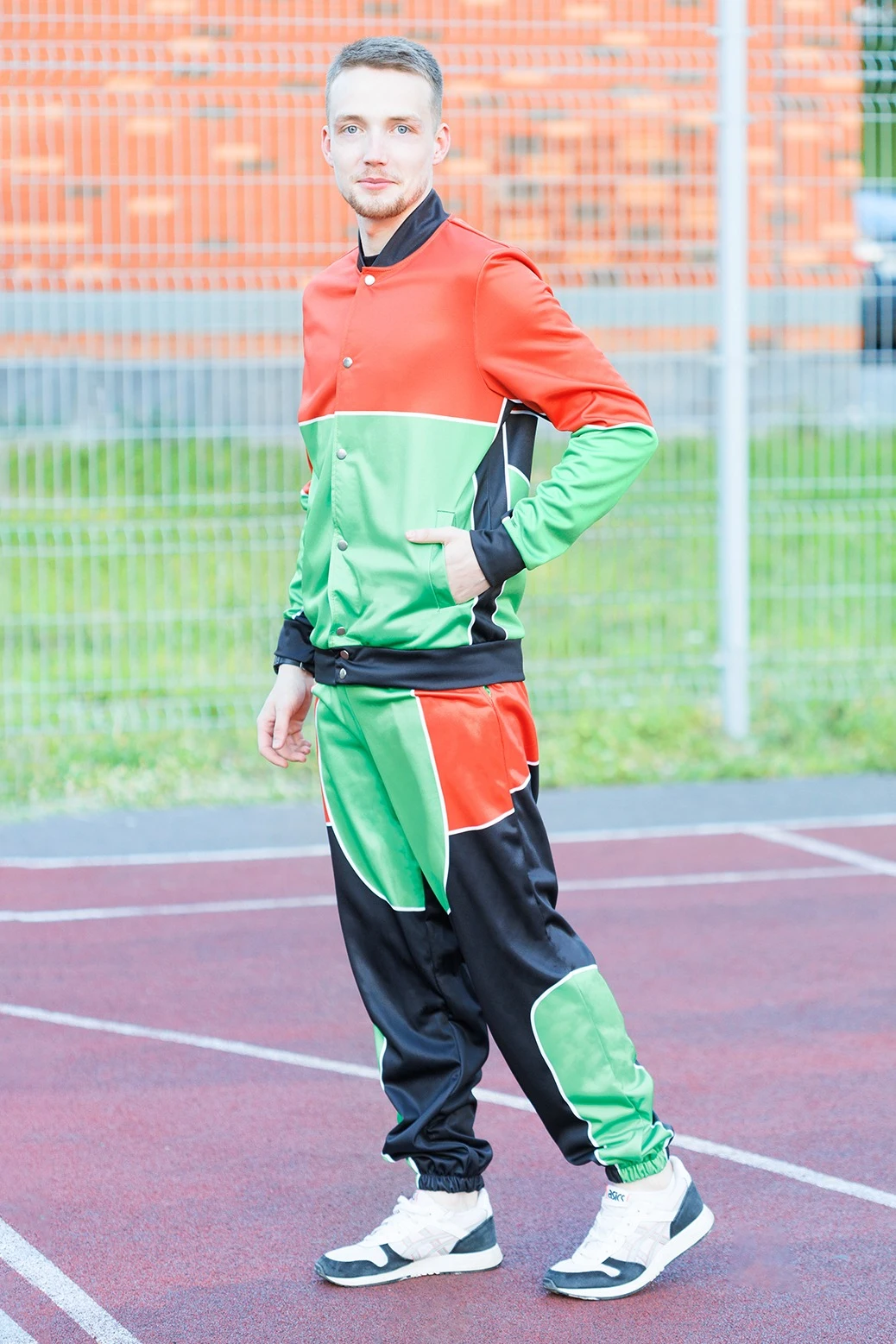 Модель. Прямой силуэт, без капюшона, без подклада. Длинные рукава с манжетами из сублимационной ткани сандвич браш. Низ бомбера и воротник с закругленными углами также выполнены из сублимационной ткани сандвич браш. Вариант застежки бомбера на выбор: на семь металлических кнопок или на молнию. Два боковых кармана в листочку без молнии.
