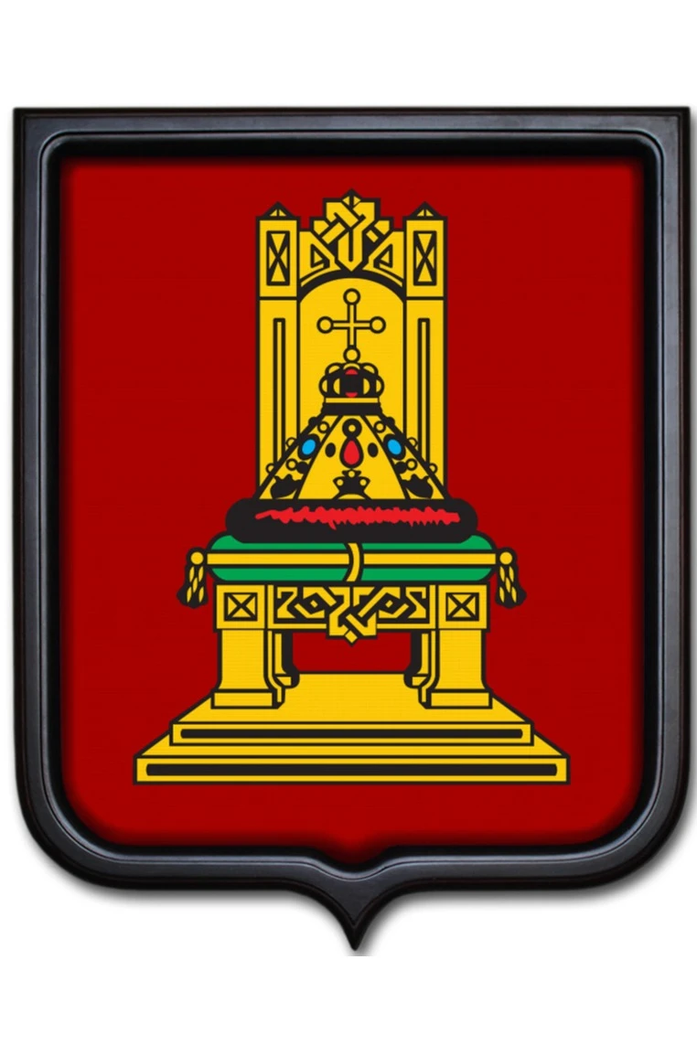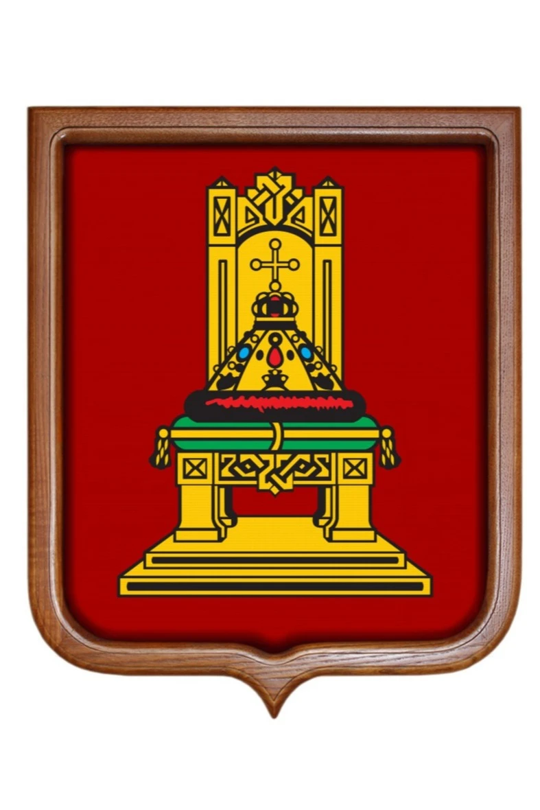 Форма: Герб имеет форму французского щита размером 35х43 см. На оборотной стороне имеется крепление "крокодил" для подвешивания герба на стену.