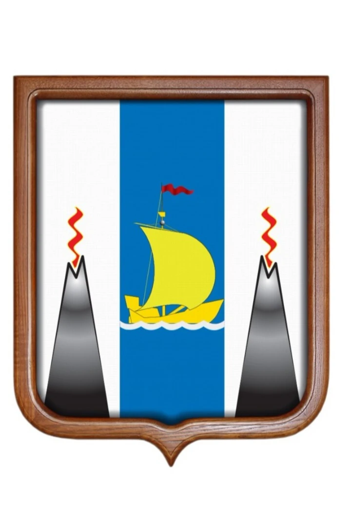 На гербе Сахалинской области, основой для создания которого служил герб Приморского края Российской империи, изображен столб синего цвета, символизирующий лазоревое небо. Внутри него располагается древний казачий коч, исполненный в золотом цвете и плывущий по серебристым волнам. По обеим сторонам от столба находятся черные вулканы, из жерла которых выходит по одному красному языку пламени.