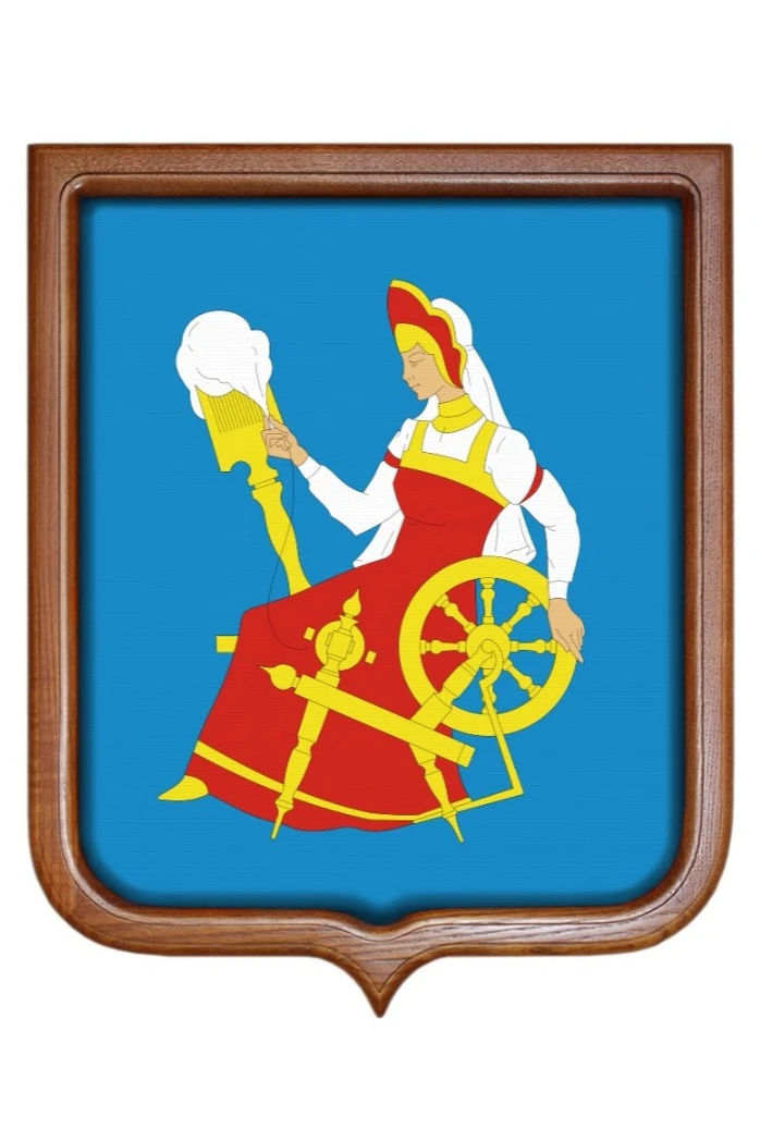 Современный герб города Иваново утвердили в 1996 году. Он представлен в виде остроконечного лазурного геральдического щита. Мы видим на нем молодую девушку. Одета она в рубашку белого цвета и красное расшитое золотом платье. Поверх головы у девушки белый платок и красный кокошник с золотым украшением. Девушка повернута к нам левой стороной. Позади нее стоит гребенка прялки с куделью. Левая рука девушки находится на колесе стоящей перед ней золотой прялки.