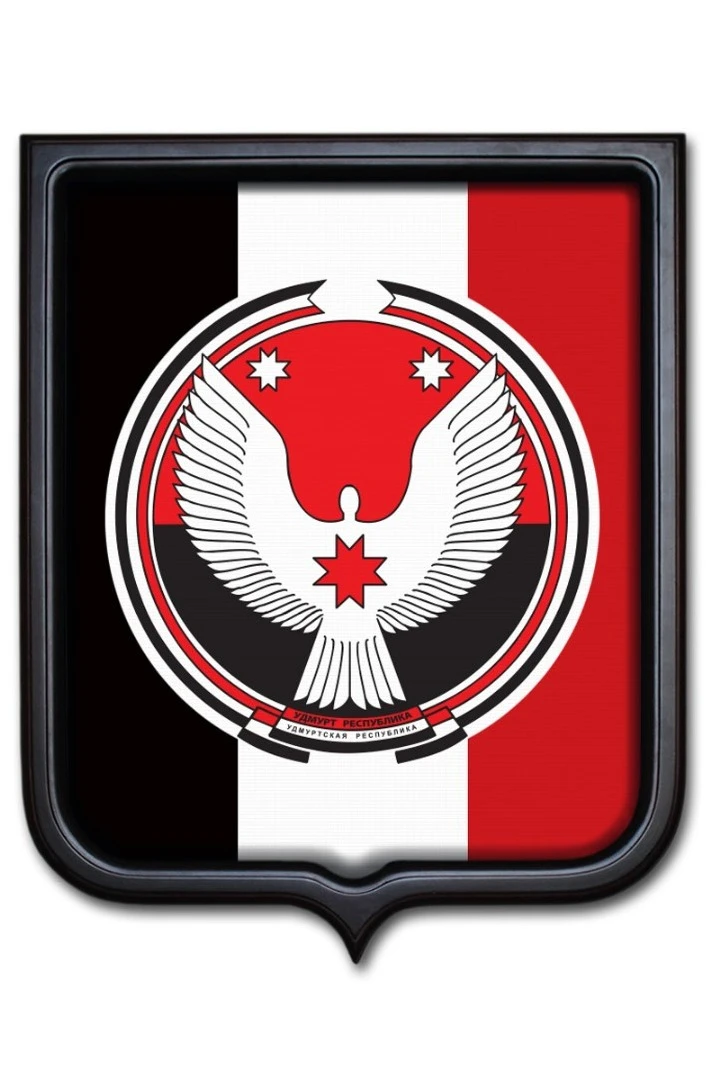 В основу герба Удмуртской Республики положены в первую очередь национальные мотивы. На круглом, поделенном поровну красным и черным полями щите, расположен белый лебедь с распростёртыми крыльями. Внутри лебедя начертан солярный знак красного цвета. Поверх крыльев также размещены два подобных знака, только белые. Обрамление щита выполнено в виде трехцветной ленты.