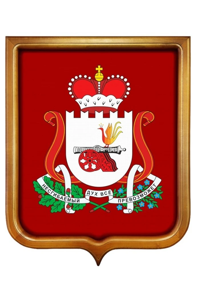 Герб Смоленской области представлен в виде белого щита с закругленным основанием и зубчатой верхней частью. По обеим сторонам от щита изображена алая ленточка, а сверху - того же цвета корона с золотым крестом. Посередине расположилась пушка с серебряным стволом на золоченом основании. На ней стоит птица Гамаюн. Под щитом скрещены дубовая листва и голубые льняные цветы с лентой, хранящей слова «НЕСГИБАЕМЫЙ ДУХ ВСЁ ПРЕВОЗМОЖЕТ».