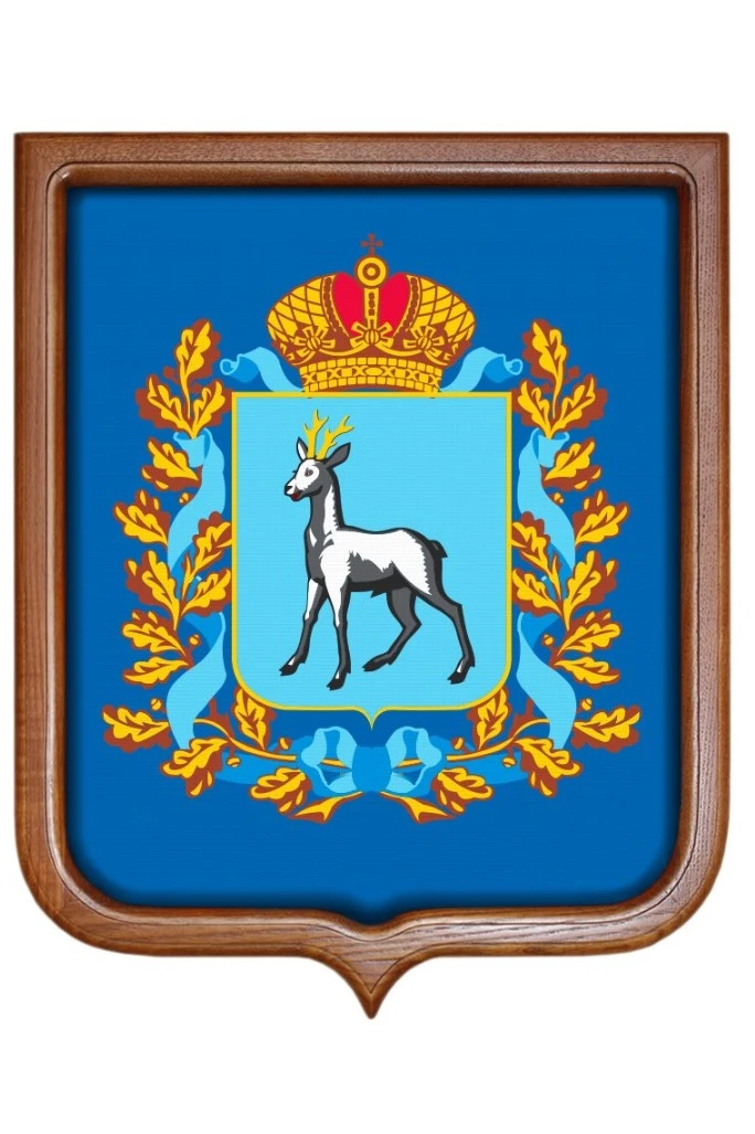 Герб Самарской области предстает перед зрителем в следующем виде. На синем фоне французского геральдического щита содержится изображение дикого козла, фигура которого выполнена в серебристом цвете. Животное имеет золотые рога. Его глаза и язык окрашены в красный цвет, а копыта - в черный. Щит покрыт Императорской короной, а по сторонам его окружают золотистые листья дуба и вьющаяся лента голубого цвета.