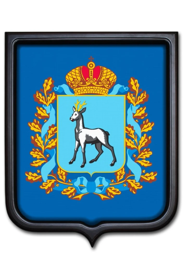 Герб Самарской области предстает перед зрителем в следующем виде. На синем фоне французского геральдического щита содержится изображение дикого козла, фигура которого выполнена в серебристом цвете. Животное имеет золотые рога. Его глаза и язык окрашены в красный цвет, а копыта - в черный. Щит покрыт Императорской короной, а по сторонам его окружают золотистые листья дуба и вьющаяся лента голубого цвета.