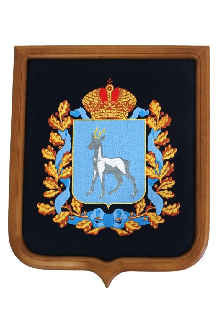 Фон: Изображение герба вышито на однотонной ткани (бархат) синего цвета, а также вышивка может быть осуществлена на другом фоне по желанию клиента, в этом случае применяется ткань сатен.