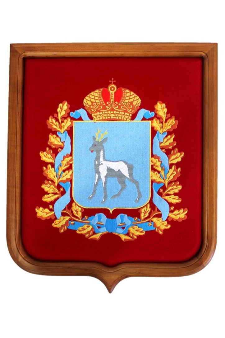 Фон: Изображение герба вышито на однотонной ткани (бархат) красного цвета или вышивка может быть осуществлена на другом фоне по желанию клиента, в этом случае применяется ткань сатен.