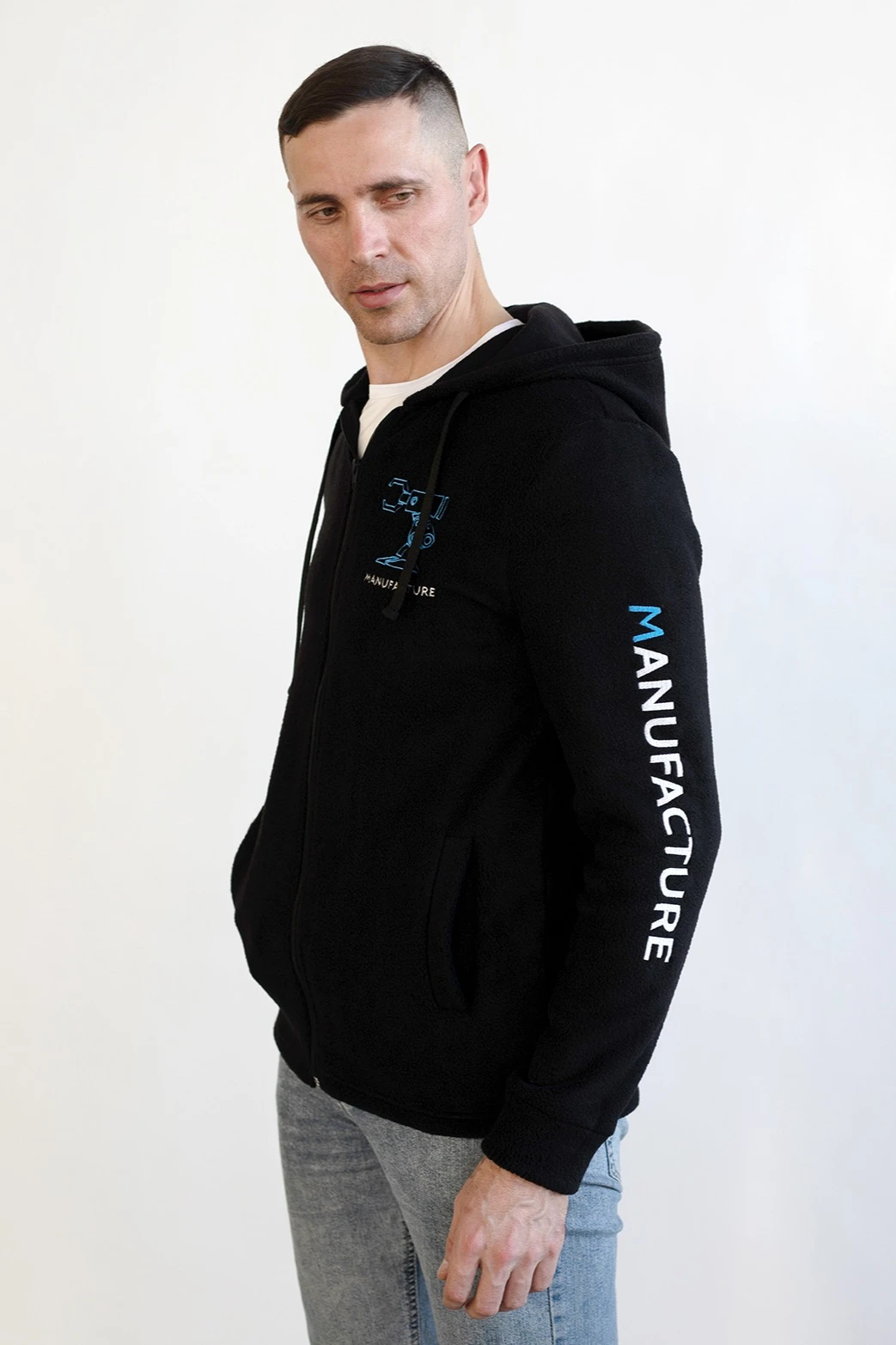 Модель. Прямой силуэт. Толстовка на молнии. Длинные рукава. По низу толстовки продета резинка и установлены фиксаторы. Толстовка с капюшоном. У края капюшона продет плоский шнур шириной 15 мм стандартных цветов.  Два прорезных кармана в листочку без молнии. Возможно бесплатное комбинирование деталей разных цветов (например, рукава могут отличаться по цвету от остальных деталей).  Толстовка выполнена из флиса 300 гр.\