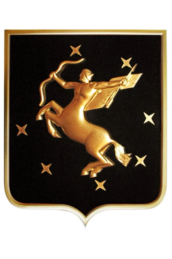 Форма: Герб располагается на геральдическом щите размером 42х50 см, обрамлённым в пластиковую раму под золото. Элементы герба золотого цвета окрашены краской под золото.
