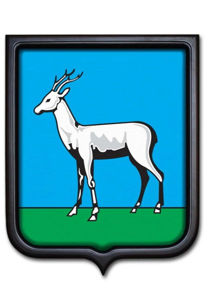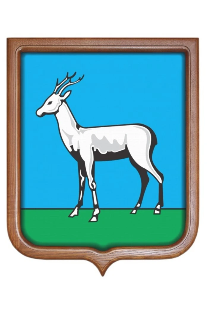 Утвержден герб города Самары в 1998 году. Это французский геральдический щит с закругляющимися нижними углами. Основной цвет - синий. Окантовка выполнена в виде тонкой черной линии. Снизу расположен небольшой участок зеленого цвета. По центру щита прорисована белая дикая коза. Над щитом располагается большая императорская корона желтого цвета с уширенным крестом.